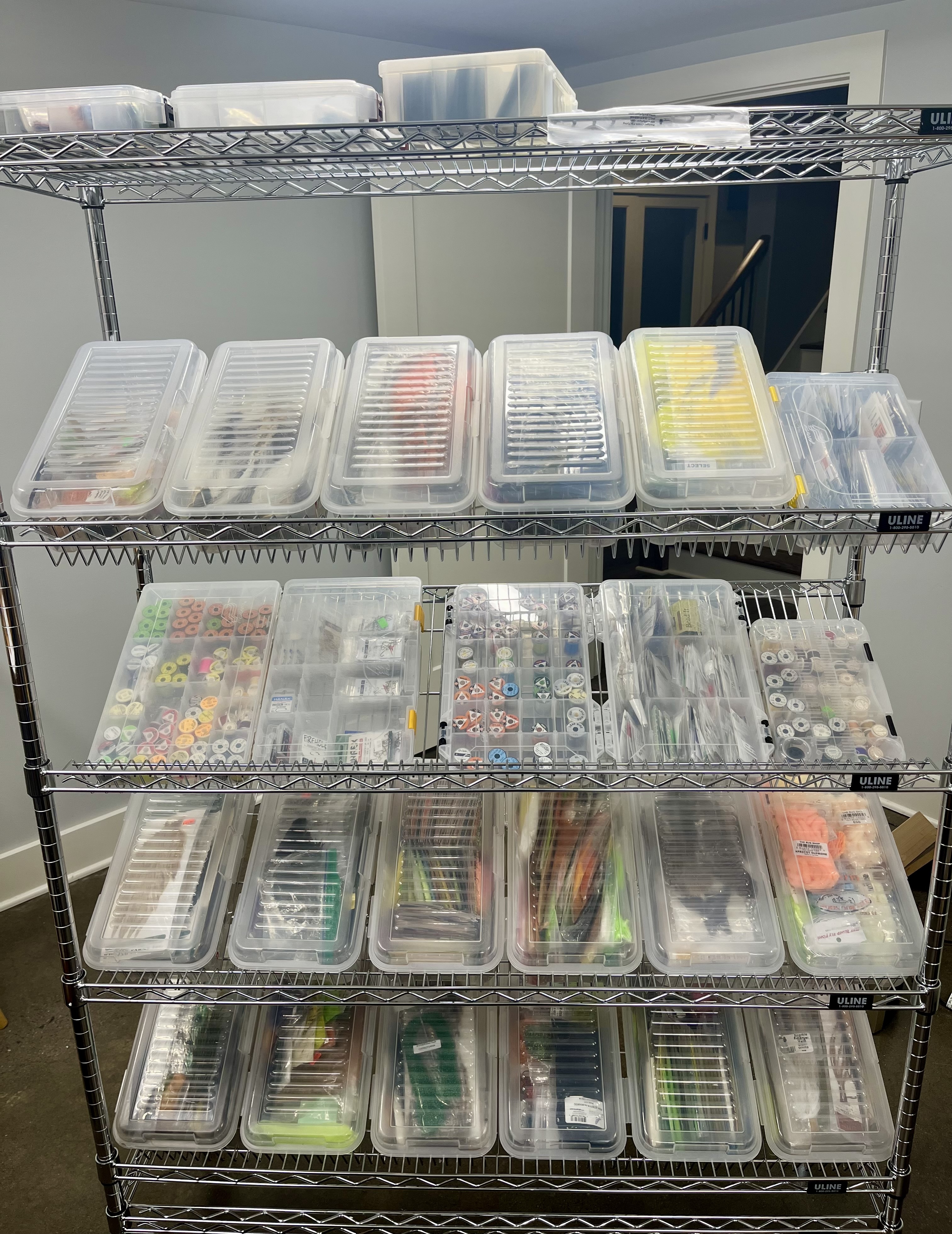BEFORE. Good lord, what a disaster. Messes grew exponentially, like a snowball rolling down a hill. While I had vast stores of tying materials in boxes, many of them were crammed to the point of being too hard to find that hackle when you needed it. What’s more, the system of box-stacked-upon-box was frustrating as hell: pick it up, move it elsewhere, find another box, re-stack it, arrrrrrrgh. Time to put an end to this madness!AFTER. Much better! Room to breathe, and, truth be told, this is a work in progress with some organizing still to be done. But this is a much more ergonomic workspace. The question you’re probably asking is, “What the heck did you do with all those boxes?”TA-DAH! Enter the Uline Wire Picking Cart. It measures 48″x18″x69″, with four angled shelves and one top rack. That’s plenty of space to hold materials bins, hook boxes, and threads and wires. But its best feature is that it’s on wheels. So all I have to do to access it from my chair is to roll it next to the desk. It’s a sturdy build with a very smooth roll, and I can reach the vast majority of boxes from my seat, which delights my lazy side no end. I’ve strategically placed the boxes I use the most on the lower three angled racks.