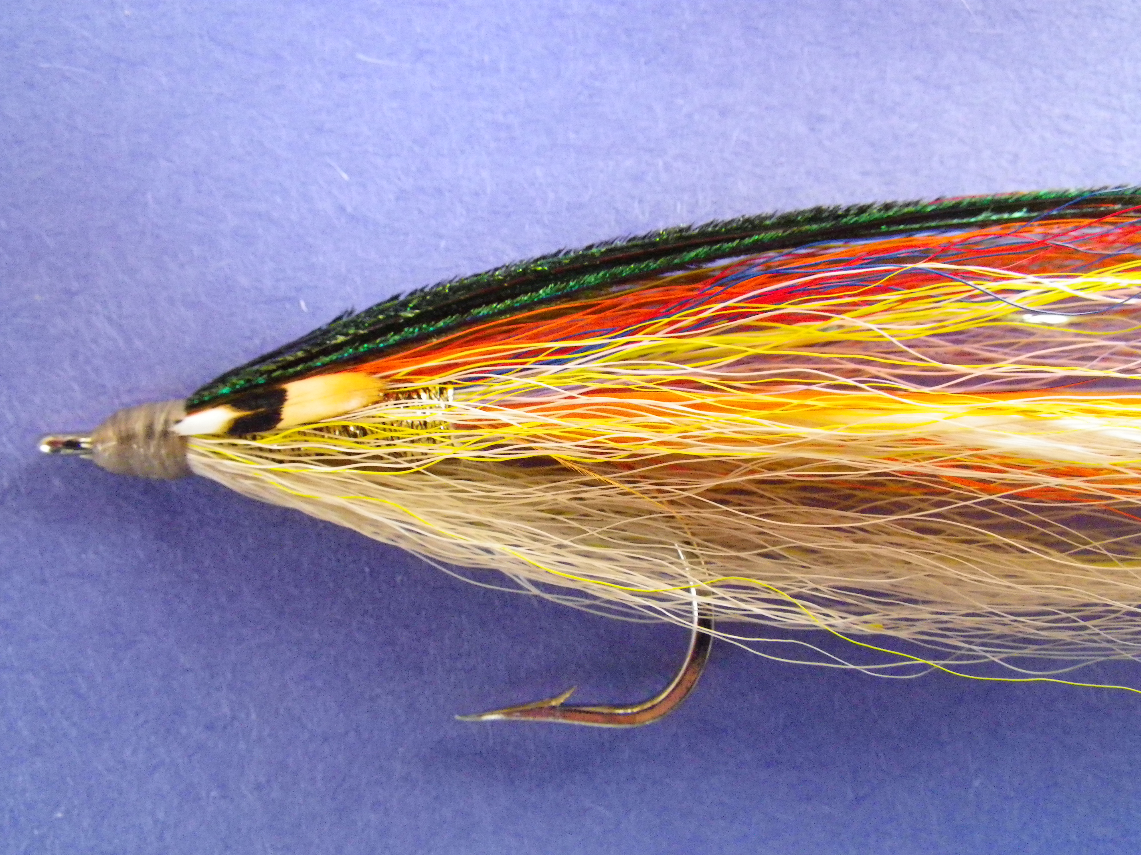 Tail: Natural white saddle, under 2 strands copper flash, under a yellow saddle under an orange saddle, under 2 strands red flash, under 30 total hairs ginger, pink and violet bucktail, mixed, under 20 total hairs pink and chartreuse bucktail, mixed, under 2 strands green flash under 20 total hairs blue and red bucktail, mixed.