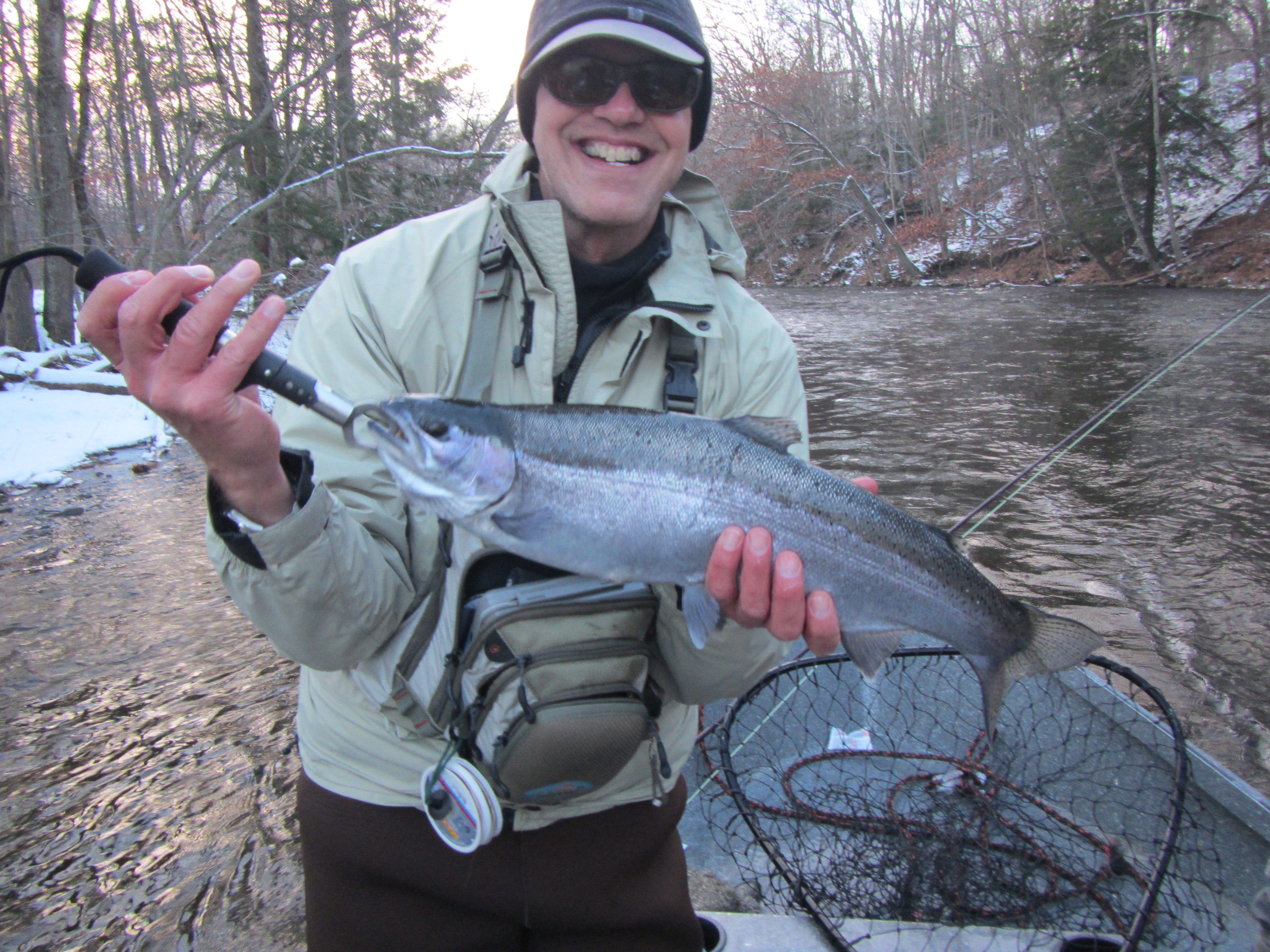 But not this year. I told him that on this trip, we’d find out if he was cut out to be a steelheader. A cold front was blowing in as we drove up. We awoke to a couple inches of fresh powder and the mercury in the teens. This was going to be a baptism in ice.