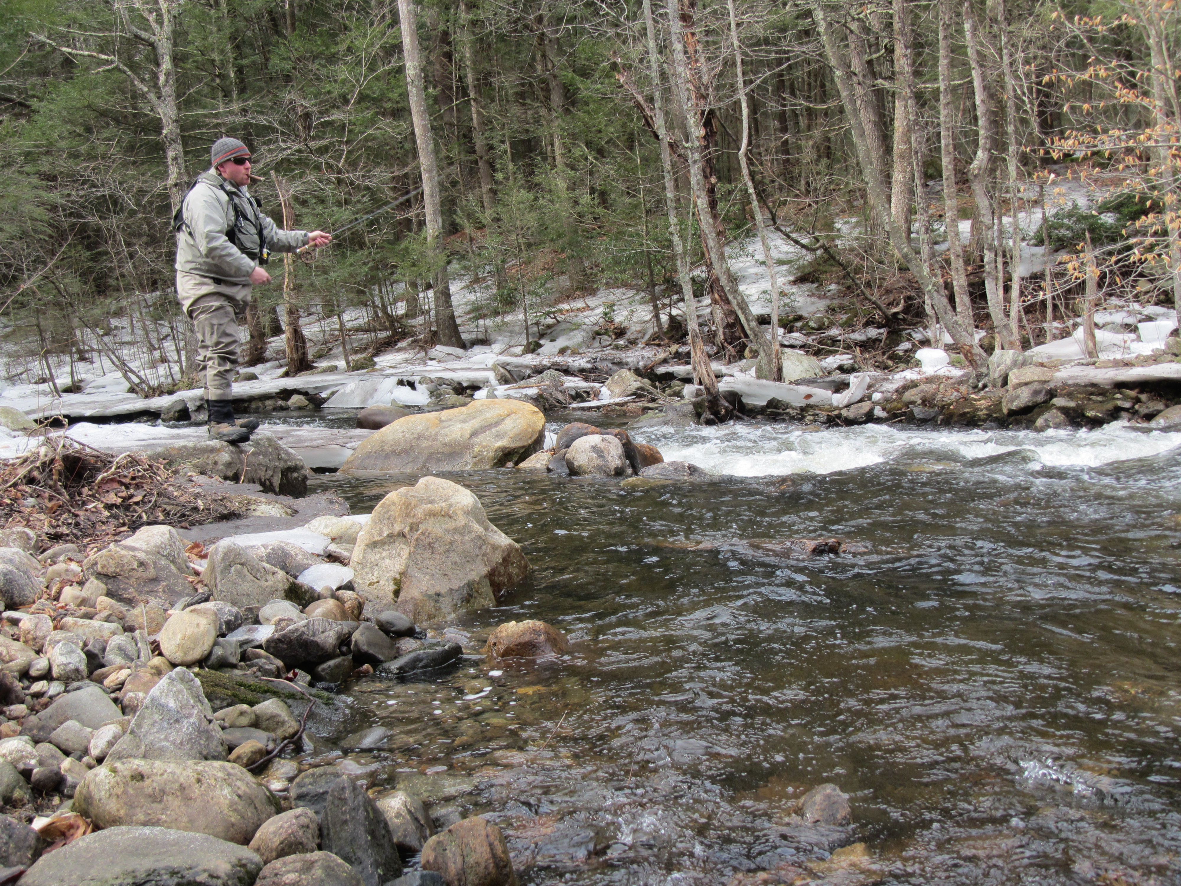 We fished River X in the Berkshires. I had never been before, and the first thing I noticed on the drive up was that there was still white stuff on the ground. The banks of the river were a patchwork of earth, snow, and ice. Frozen shelves still extended from the shore, and while clear, the water was high from runoff. Even more telling, its temperature was a bracing 34 degrees. In April. Not so good for the fishing. Grady took one lonely brookie on an ICU Sculpin, and your humble scribe wore the collar. Here are a few photos from our adventure.
