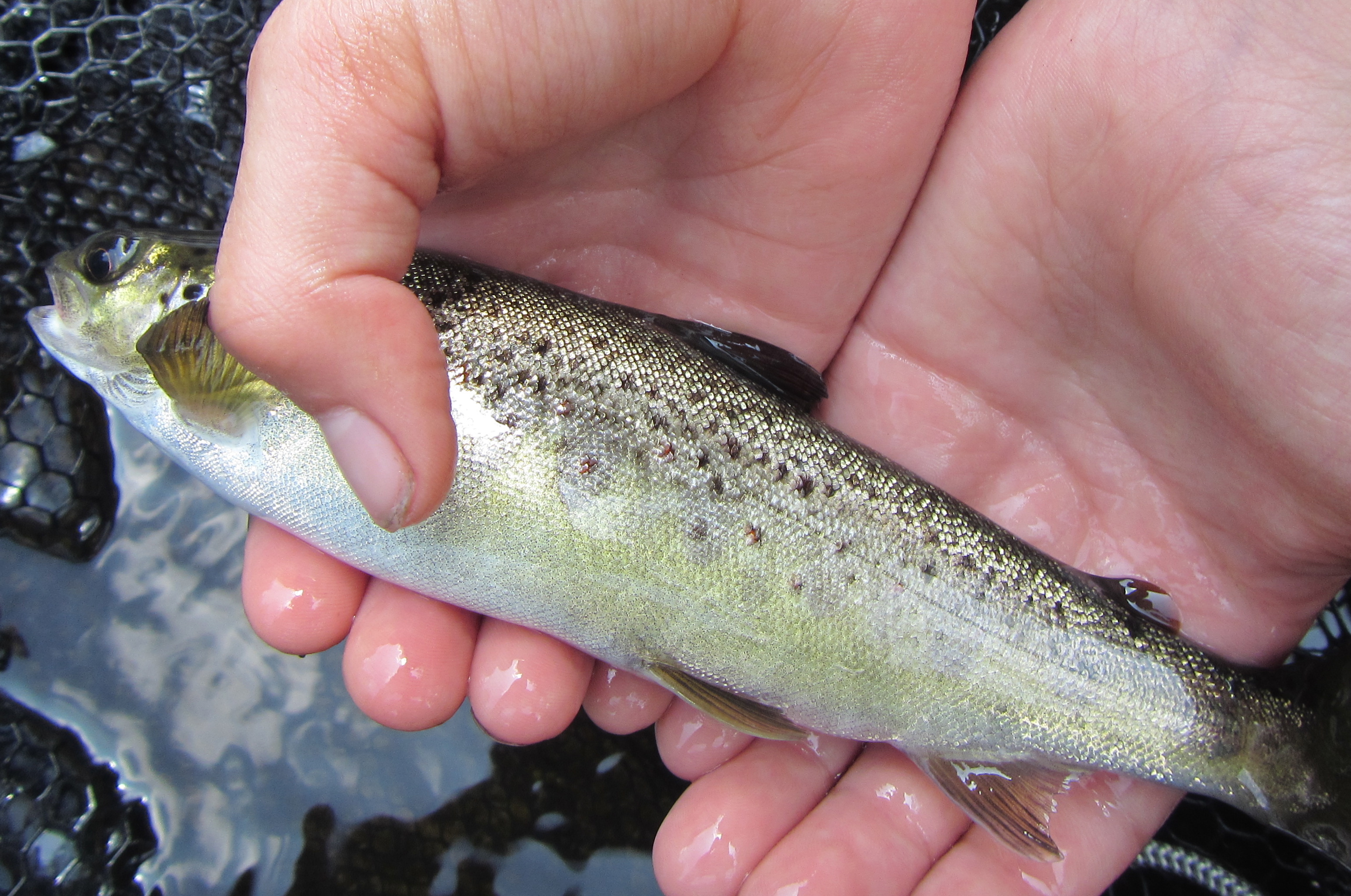 This rainbow has been in the river for a while. Well-defined pink lateral band, intact scale pattern, perfect fins.