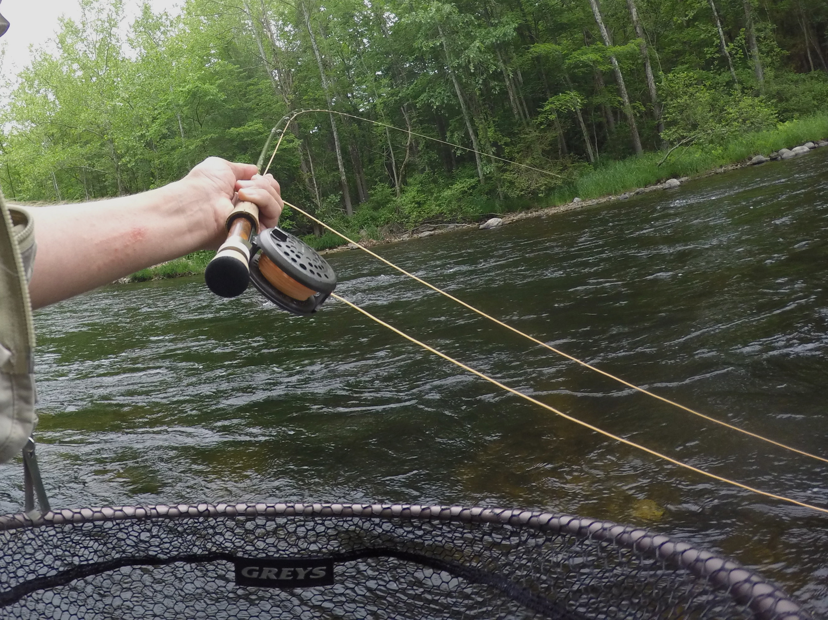 On Saturday my son had a soccer tournament in Avon, and I had a two hour fishing window between the afternoon and evening games. So I hightailed it to the lower river for a highly productive and entertaining two hours of fishing between 4:30 and 6:30. Caddis were out (mostly smaller, size 16). But the real story was my first sighting of Light Cahills. (Call them what you will — Vitreous, PEDs, whatever — if they are creamy-colored size 12 mayflies that hatch in the late afternoon in May, I go with Light Cahills.) it was a proper hatch — I’d rate it a 7 on a 1-10 scale — and there were plenty of trout having at them, slashing and splashing and making a general spectacle with their showy takes.