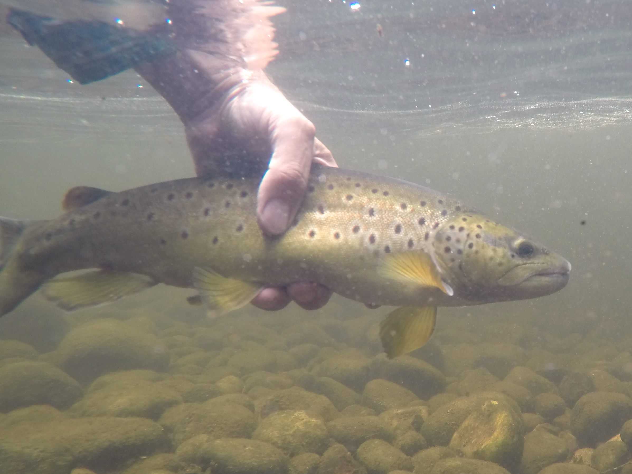 Next, I focused on a run with a mottled surface that was moving at a moderate walking pace. The hatch began to pick up in intensity, but I still had no takes. So I swapped out the bottom and middle flies (SHBHPT and Dark Hendrickson, respectively) for a size 12 Light Cahill winged wet and a size 14 Pale Watery wingless (Magic Fly). That made all the difference. I caught trout after trout for the better part of 75 minutes. They took all three flies (Squirrel and Ginger was the top dropper), but the Cahill and the PWW were the focal points.