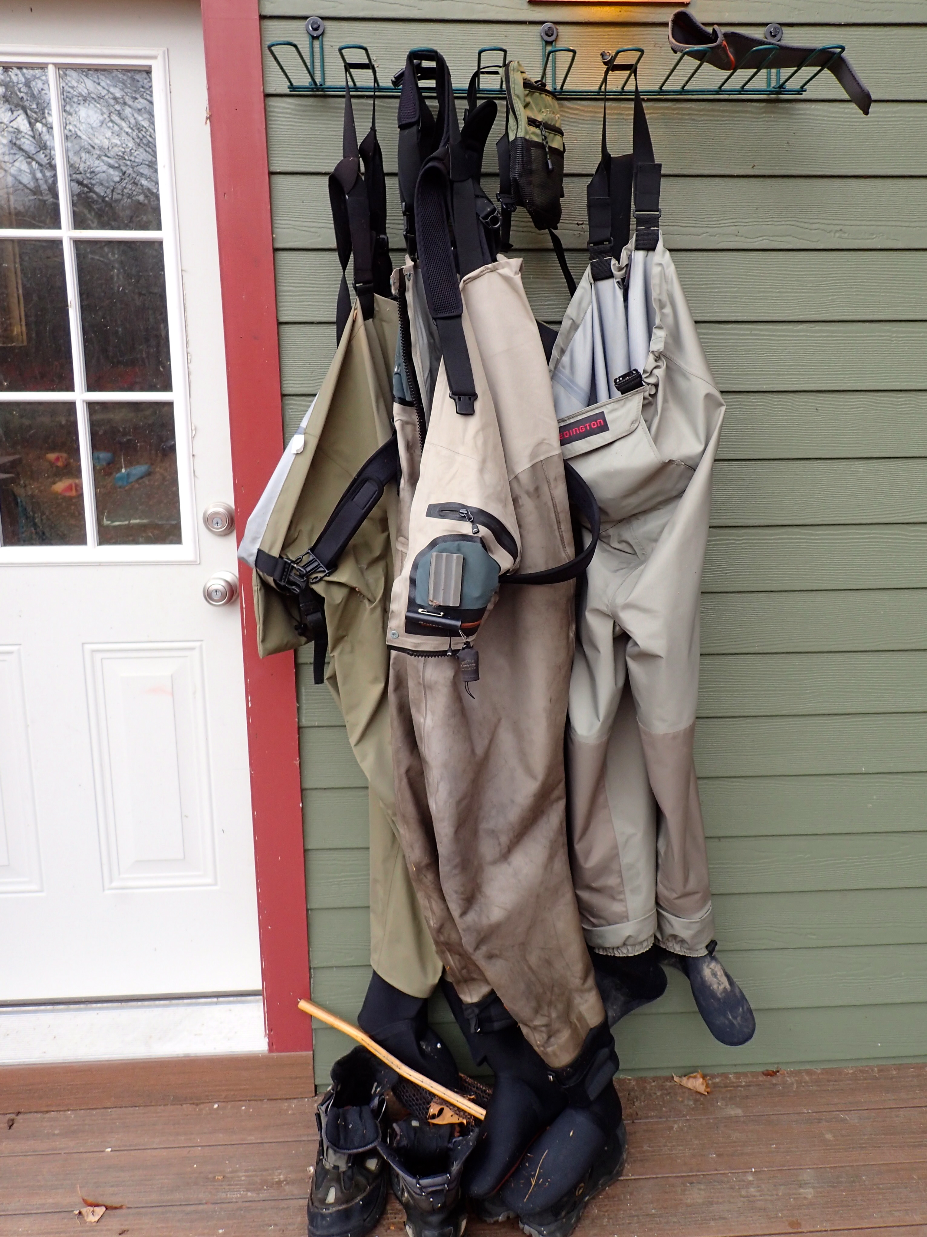 So much depends on a pair of tan waders, glazed with river water beside the white door.