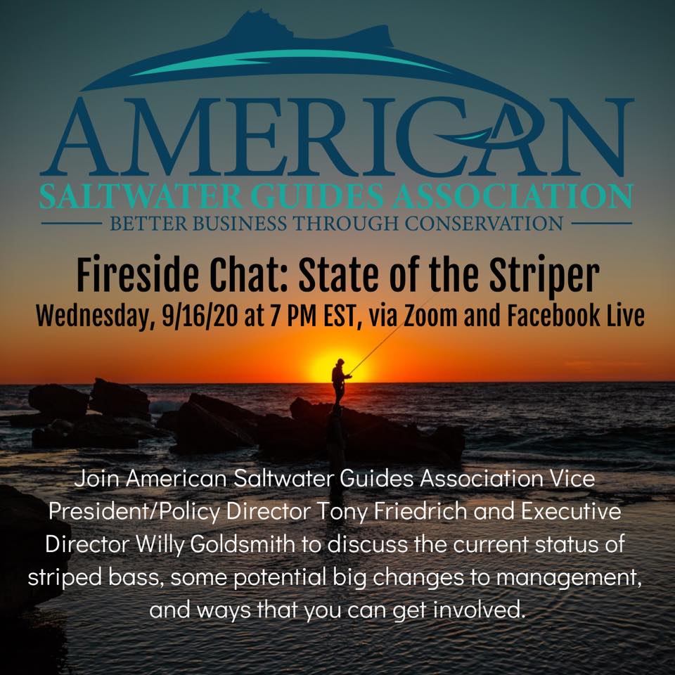 From the American Saltwater Guides Association: “Join the ASGA team for a Fireside Chat focused on the current state of the Striped Bass! The chat will be LIVE this Wednesday, 9/16 at 7pm. Tune in via Zoom or Facebook Live! This is a great way for members of the fishing community from all backgrounds to learn something new, ask questions and be a part of the dialogue.” Register at: https://us02web.zoom.us/meeting/register/tZEtcO2sqzMjHNczidcP8mqBjyfM2113PGFw