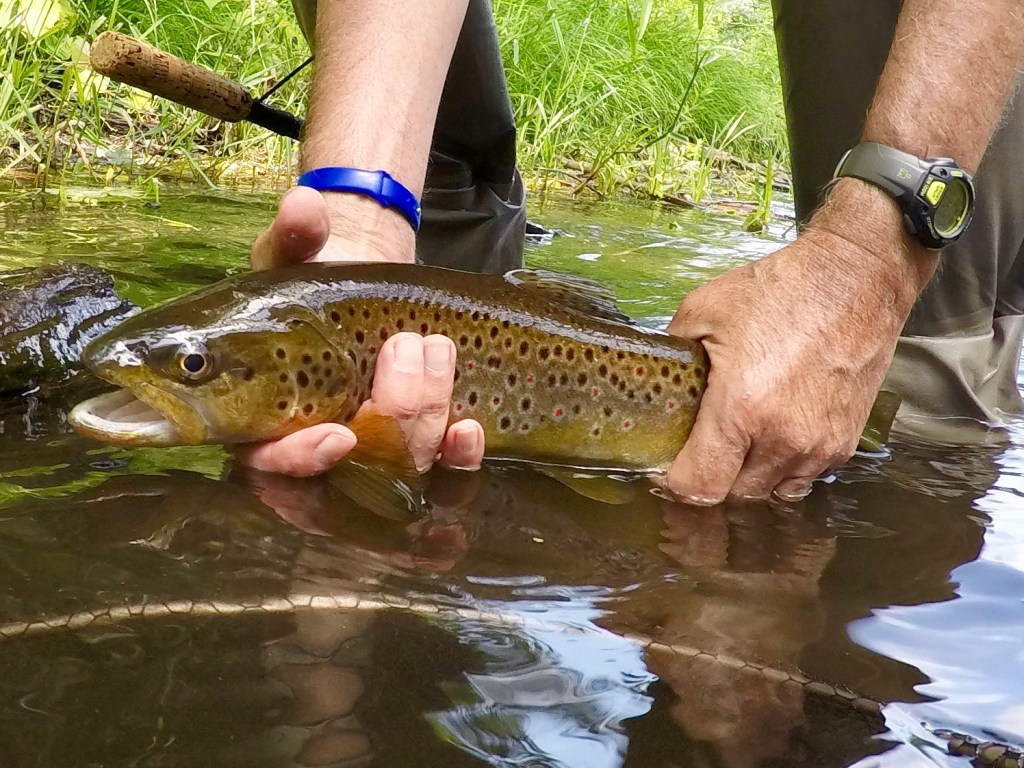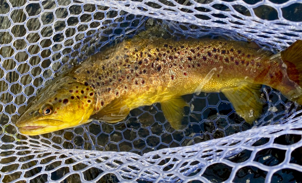 In my report from that day, I stated that if Don learned wet flies, he would become a dangerous fish-catching machine. Although conditions have been challenging in the last couple months, Don has kept at it. Last week he scored this gorgeous brown on a Squirrel and Ginger. I think it’s a Survivor Strain broodstock — that looks like a left-eye elastomer and clipped adipose. Way to go, Don!