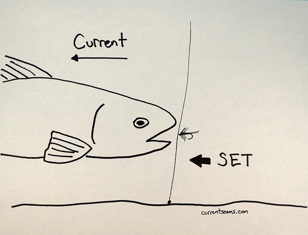 A proper nymphing hook set goes downstream, into the mouth and the mass of the fish.