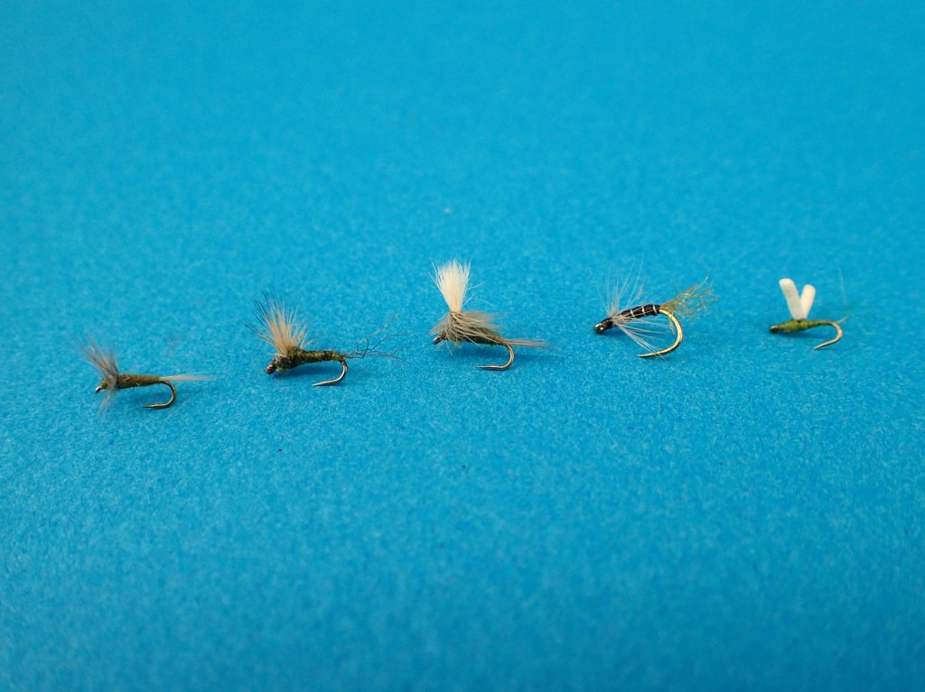 My tiny BWO dry fly arsenal includes, from left, comparadun, comparadun with Z-lon shuck, parachute, Pat Torrey’s Tiny BWO soft hackle, and foam wing. The trout sometimes favor one of these over another, and the only way to figure it out is to cycle through patterns. By the way, this concept applies to other tiny hatches, like midges.