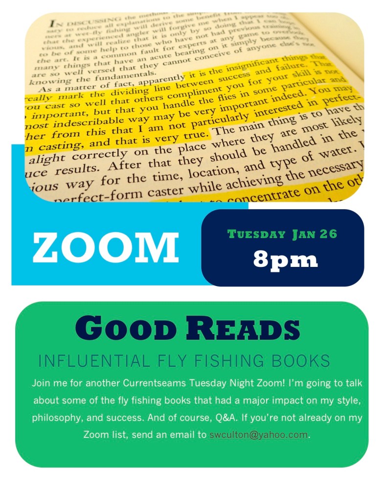 We’re keeping the Currentseams Tuesday Night Zoom ball rolling. I’ll be talking about some of the fly fishing books, old and new, that had a major impact on me, from how I fish to my general fly fishing philosophy. Autodidacts like me just can’t get enough of a good read, and I hope to turn you on to some books you might find invaluable. See you Tuesday Night!