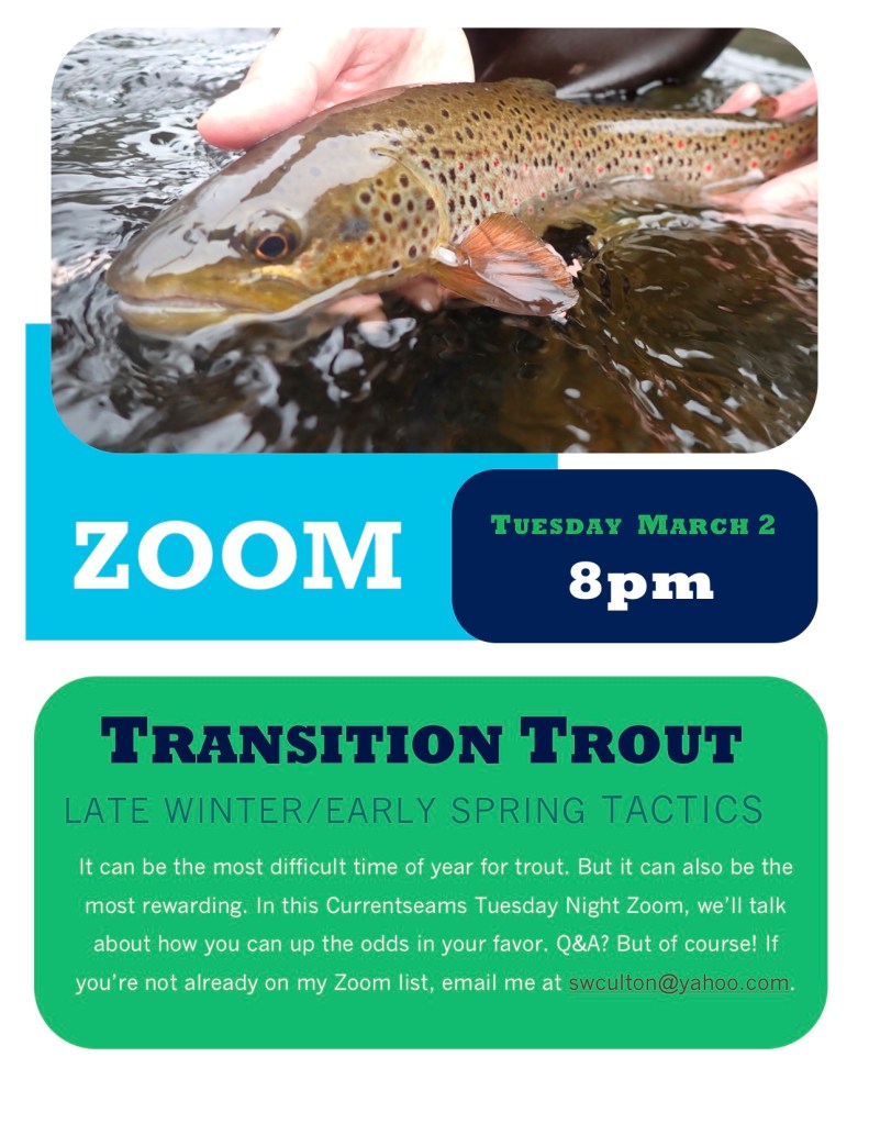 Currentseams Tuesday Night Zoom 3/2, 8pm: “Transition Trout: Late Winter/Early Spring Tactics”