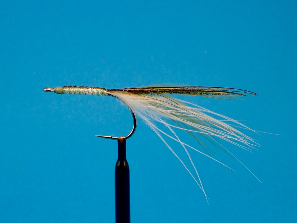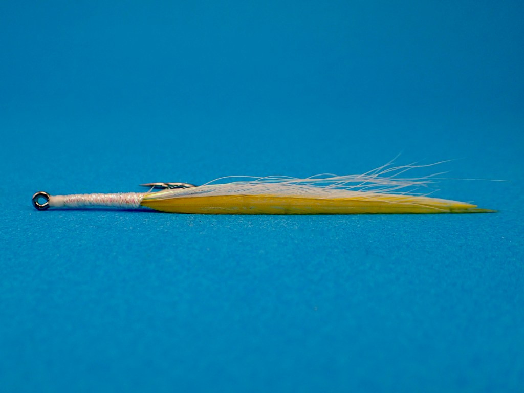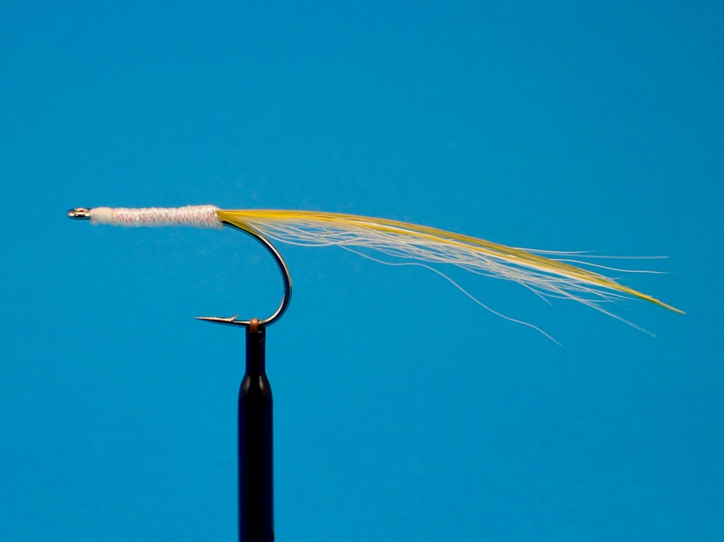 Ken Abrames’ Eelie. Hook: Eagle Claw 254 sz 2-1/0. Tail: White bucktail, then a white saddle, then pearl flashabou, then a yellow saddle, then an olive saddle. Body: Pearl mylar tubing. Wing: None