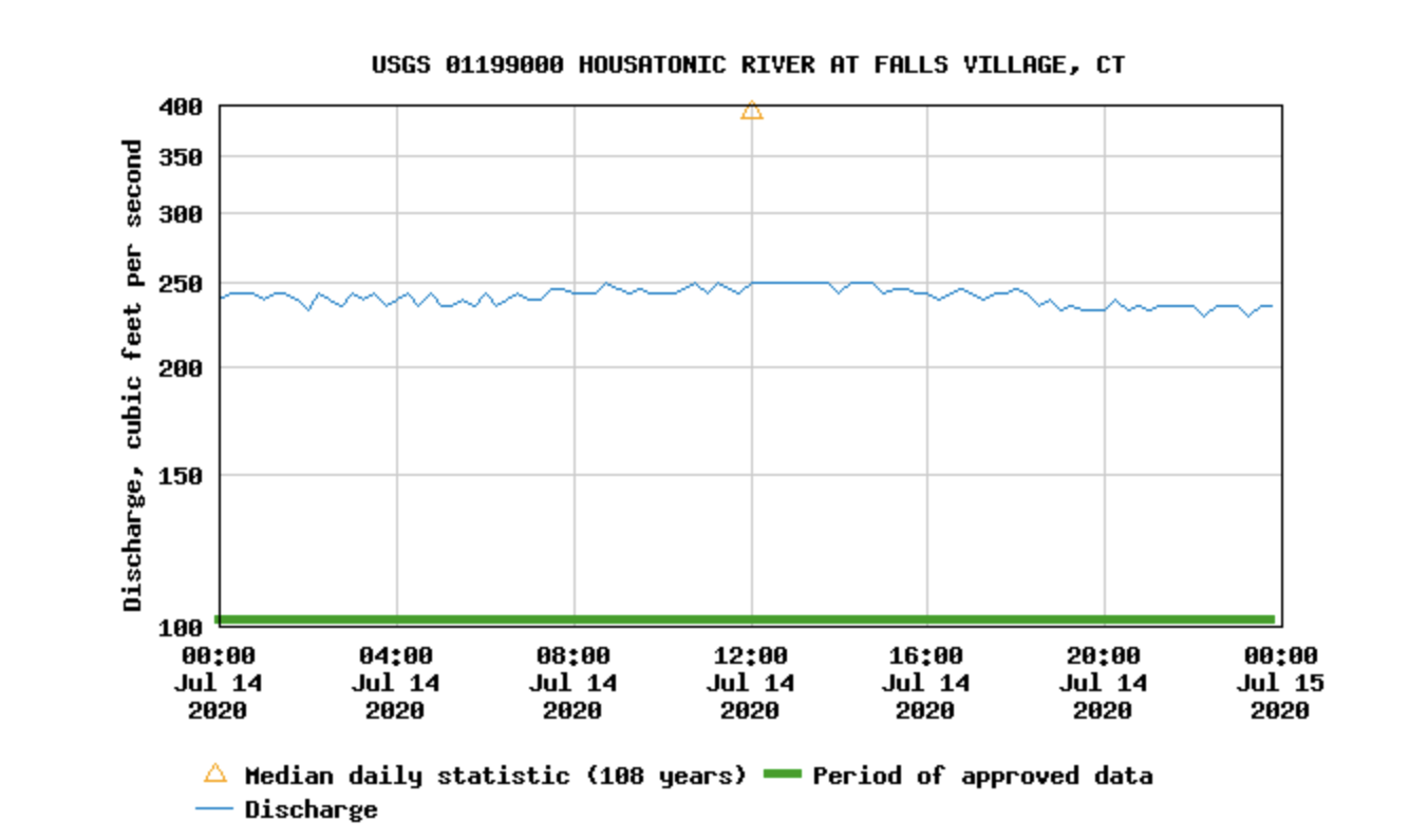 Last year at this time, the Housatonic was medium low. (This is about 100cfs below historical normal.) We were in the beginning of the drought, and while manageable, the flow never got consistency higher than this for the duration.Yikes! What a difference a year makes. Twenty times the amount of water, and I’ll consider us fortunate if it comes down to 1K some time next week. I generally favor high water over low water, but this episode makes one reconsider that position.