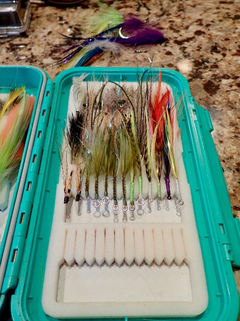 The right side of the box is a hodge-podge of patterns: a few more tiny shrimp and baitfish, some smaller bucktails and single feather flatwings, some weighted patterns just in case, a Gurgler and some already used Big Eelies if bluefish are around. Time to fill in that top row.The top row gets the bigger stuff: squid patterns, Gurgling Sand Eels, Eel Punts, etc. I usually keep a dropper rig in my chest pack, pre-tied and ready to go, sealed in a zip-lock baggie. And there you have it. Let’s hit the surf! And the flats. And the salt ponds. And the estuaries. And the boulder fields…