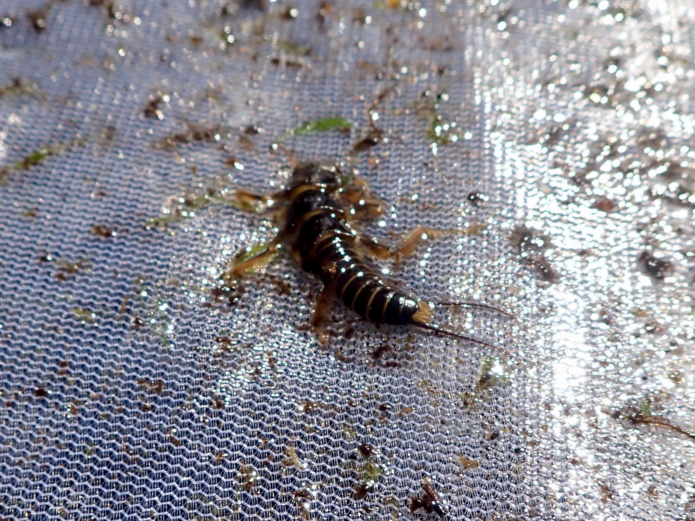 Early morning on the first day. Cam might be contemplating the fish at his feet, or the sheer beauty of his surroundings. These streamside boulders are typical of the South Platte in Cheesman Canyon, and sometimes these behemoths are in the river proper. Along with the smaller boulders, it makes for the kind of structure trout love. On both days, my experience was: find one fish, and there are a bunch more close by. I think we saw a half dozen other anglers on Wednesday. Friday, the “crowded” day, maybe twice that many. I fear that western anglers would be mortified by the hordes on eastern streams.Afternoon on the first day. The water is at 250cfs and running with breathtaking clarity. It was easy to pick out fish, especially if you knew where to look (on day one they were holding in riffly moving water 1-2 feet deep). This slot extended far down the glide past where I was standing when I took this photo. Both Cam and I hooked fish along the entire length of this wrinkled water center stream.Day two. The water is up to 300cfs. Our guide, Chris Steinbeck of the Blue Quill Angler, said that Thursday morning the water had some color, but cleared up after noon. I think I liked this height better; having no experience to compare to, I’d call this flow medium. Here’s what’s so wonderful about the South Platte: there are fish everywhere. Compare to the Farmington, where there are vast stretches (especially now) of unproductive water. I caught more brag-book trout in an hour on the South Platte than I might in a month on the Farmington. If you can read water, and make adjustments like weight and indicator position, and perform quality drifts, there’s no reason why you can’t do likewise. Cam doesn’t fly fish, and he stuck over a dozen trout on day one.I believe the river is so productive because of the high percentage of viable water. The analogy I came up with was the South Platte is like a high-gradient northeast wild brookie stream, times 10 in size. See what I mean?A so-ugly-it’s-beautiful golden stonefly from Chris’ Friday sampling. We also came up with midges and baetis and PMD nymphs. There were a couple stray salmon flies flitting about over the course of both outings. Not shown: scuds, an important food source for South Platte trout. I creamed ’em the first day with Pat Dorsey’s UV Scud.Compared to the Farmington and the Housatonic, wading the South Platte is a walk in the park. Absent the fast-moving, deeper sections, this was about as tricky as the footing got. (I still don’t see why the possibility of falling in should prevent me from getting into the best position to catch that fish — although I’m pleased to report that I did not go swimming on the South Platte.) Much of the river is granite sheets and smaller gravel bottom. Bottom snags were few and far between; I didn’t lose a single rig the entire trip. As you can see, the rocks are covered with this mossy vegetation, hence the substantial scud population. Clearing weeds off of flies and rigs was a constant task, although it served as a good reminder that my presentations were where they should be. Coming next: Part 3 — The Fishing.
