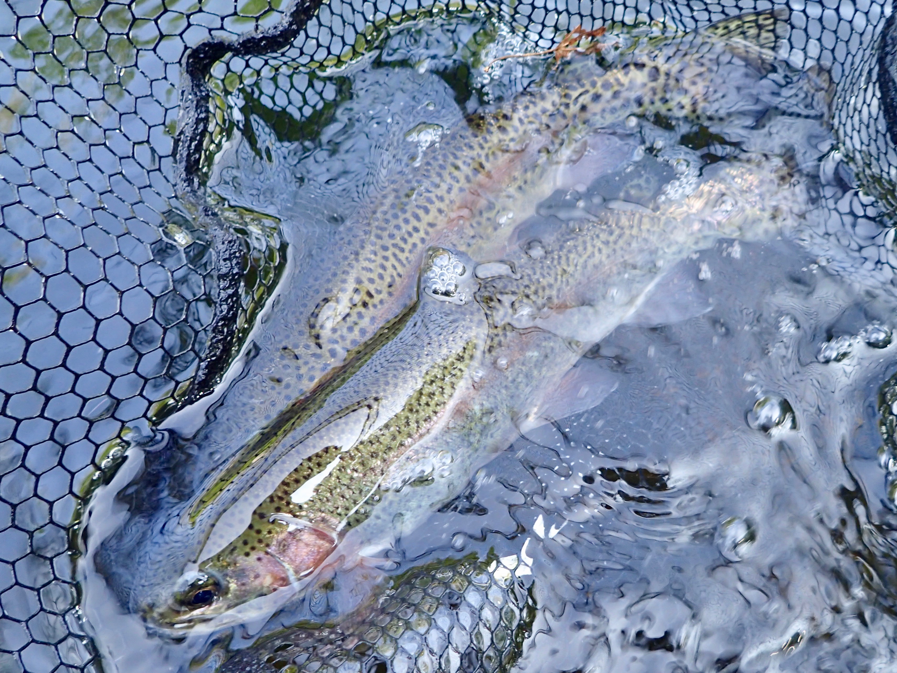 Al struck first, connecting with this lovely rainbow. How wonderful it is when theory is put into practice, and the trout do the rest of the heavy lifting. Both anglers did a great job, and enthusiastically embraced fishing under the hatch with wet flies.Same fish, heading for home. Most of our action came on creamy sulphury mayfly soft hackles and wingless wets.Does this guy look like he’s having fun? Al had to leave, so Michael and I walked a boulder field, picking pockets with wet flies. Today’s lesson is: When the water is low, look for the fastest, deepest water you can find, and cover every pocket, slot, and seam. By using this method, Michael found multiple trout willing to jump on. I loved his enthusiasm.