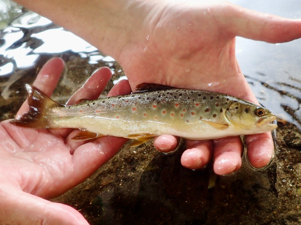 Wednesday, the weather forecasters blanked. They called for showers and light rain starting at 6pm. The showers started at 1:30pm, and evolved into a steady rain that went on the rest of the day. That didn’t dampen the spirits of Kevin, who was taking a wet fly lesson with me. The water in the PTMA was down 50cfs and had cleaned up considerably. We arrived at the spot to see fish rising, and we connected within a few first casts. A couple more bumps and a juvey Atlantic salmon, and then it was over.