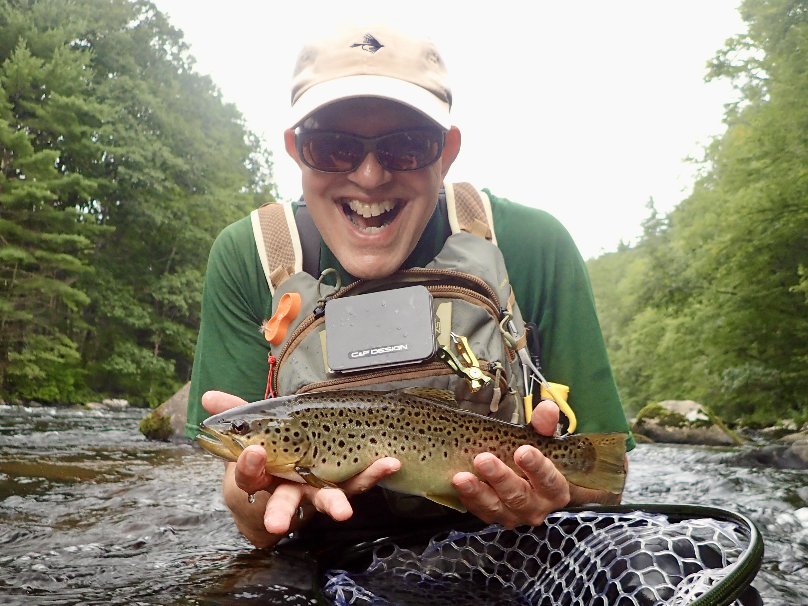 My apologies or not getting this out last week. I’ll try to be a little more timely. The good news is that the terrible weekend rains mostly missed the Farmington, and the river has been fishing very well. Last week I guided Dan for a late afternoon-into evening session. The focus was on dry flies, and we started off with a hopper/dropper system. (‘Tis the season! And I promise, no more parenthetical statements.) We discovered a pod of trout taking emergers in a shallow run in bright sunshine. When Dan dialed in his cast and drift, his hopper got crushed by a very respectable mid-teens brown. We found another run formed by the confluence of two sections of river, but we couldn’t buy a hit. Even when we switched to wets, it was no dice. My best guess is that they were feeding on something far smaller than what we were throwing.