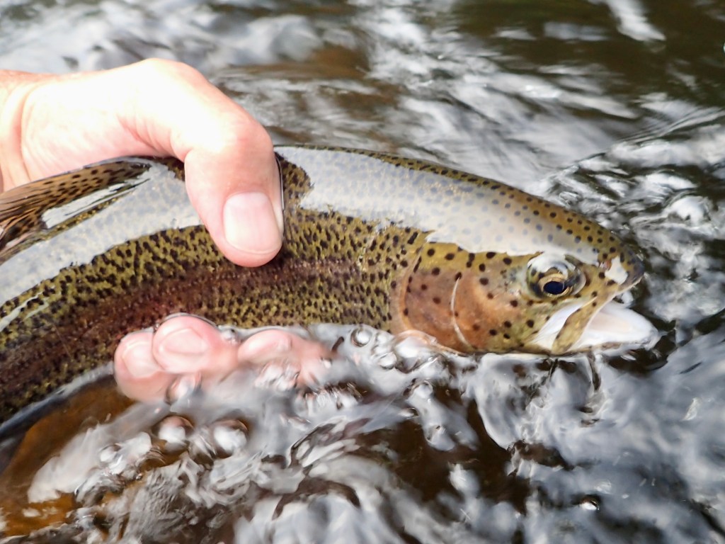 I wasn’t worried about the hook set as the fish clobbered the fly. I had fresh Maxima 4-pound as my tippet. I was going to land this mini-steelhead. I wish Chad a better picture for you, but I wanted to get her back to swimming. Besides, the light was lousy. And so, off she went.