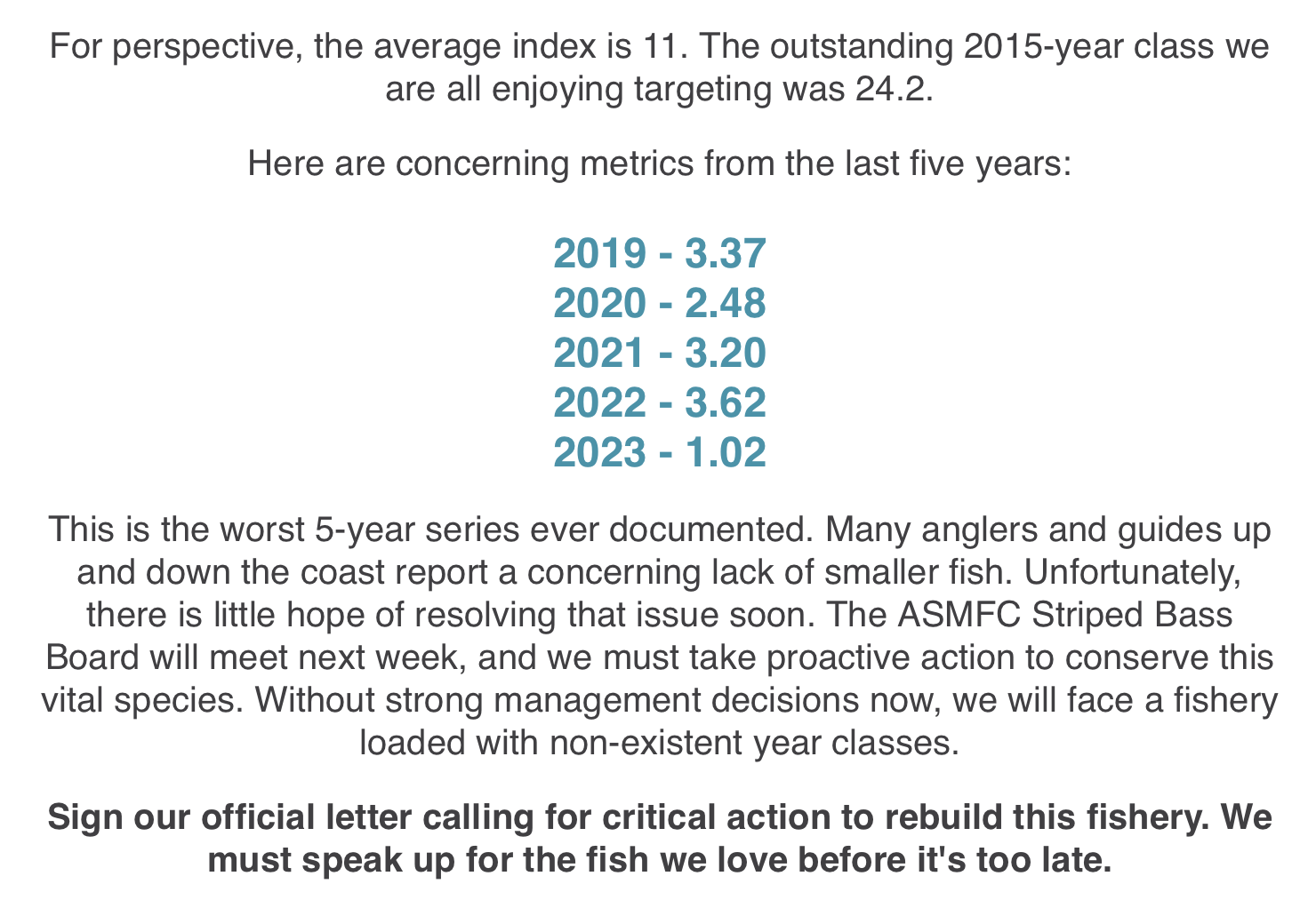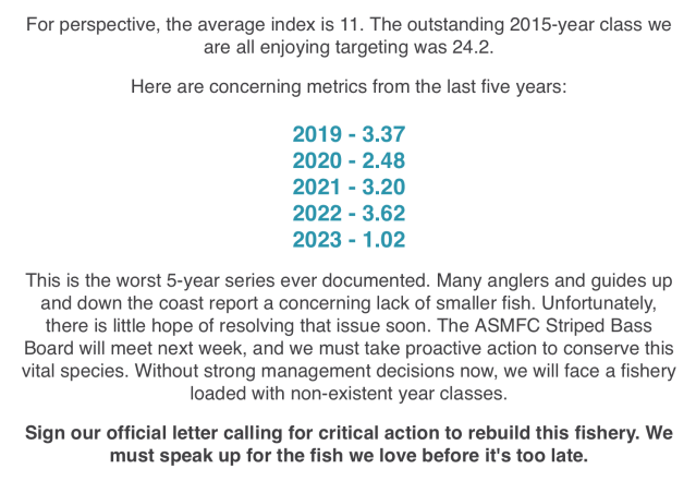 Finally, please take a minute out of your busy day to sign the ASGA letter to the ASMFC. Striped bass desperately need us to take action now. The following graphic on the Juvenile Abundance Index tells a dire story: