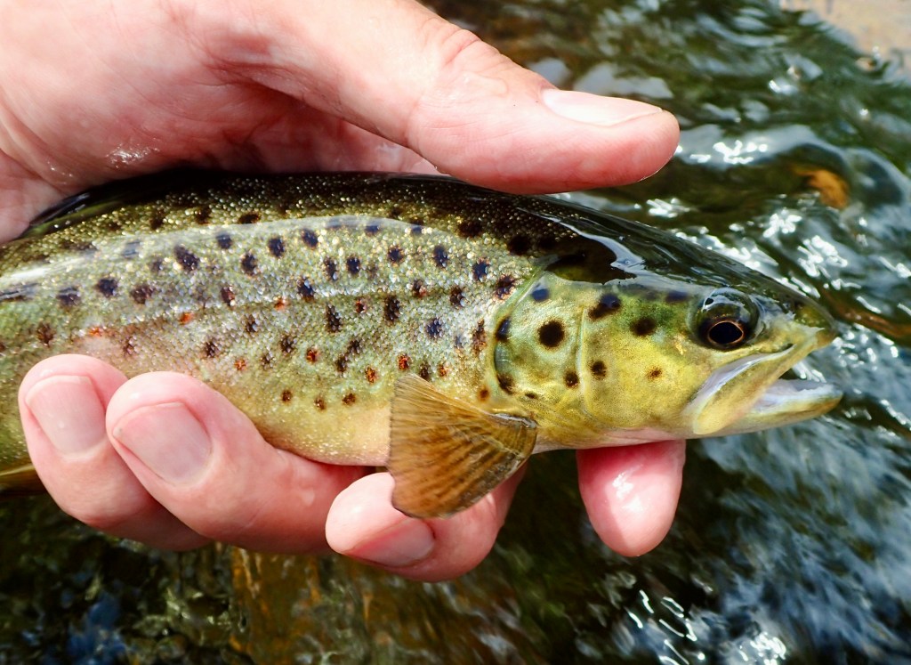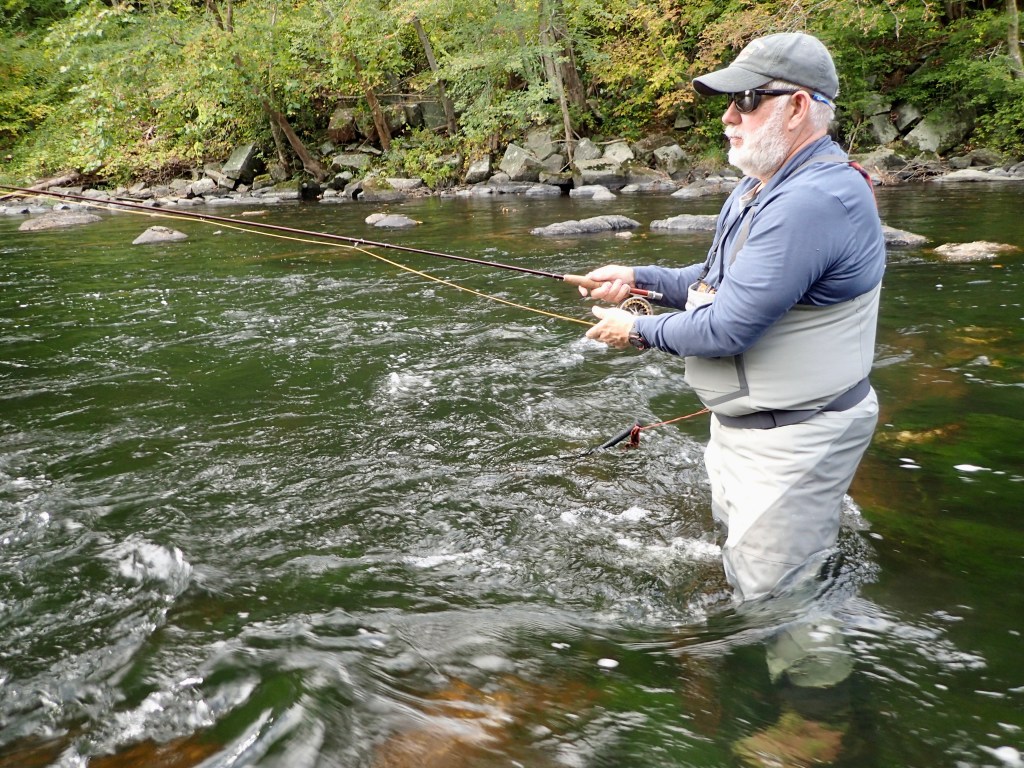 I did two lessons last week on the Farmington. On Tuesday, I took Joe on a wet fly excursion. We stuck to the lower river; at 140cfs, it had the most water, and the weather was cool enough that the water temp never got higher than 66 (3pm). The fishing was predictably slow; we found success by moving around (we fished three different marks) and targeting the deepest, fastest-moving water we could get into. Joe was a strong wader, and sometimes that’s the difference between fishing and catching. Trout love to hang out in places that are difficult for land animals like humans to navigate. Joe stuck four and we put three in the hoop. In difficult low-water conditions, that was pretty darned good.