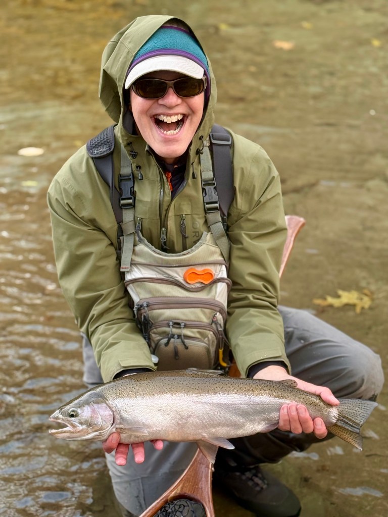 Silver in the gold of the morning light. Clearly, this first pod of fish came in from the lake overnight — newly-minted coin bright, aggressive takes, and spirited runs. Their freshness, the speed of the water, and the rocky bottom made for some challenging landing conditions. They weren’t bashful about leaping out of the water, or peeling off line in a hurry. Each one brought to net was a hard fought victory; each release a moment to savor, coupled with the thought that we might cross paths again this winter.