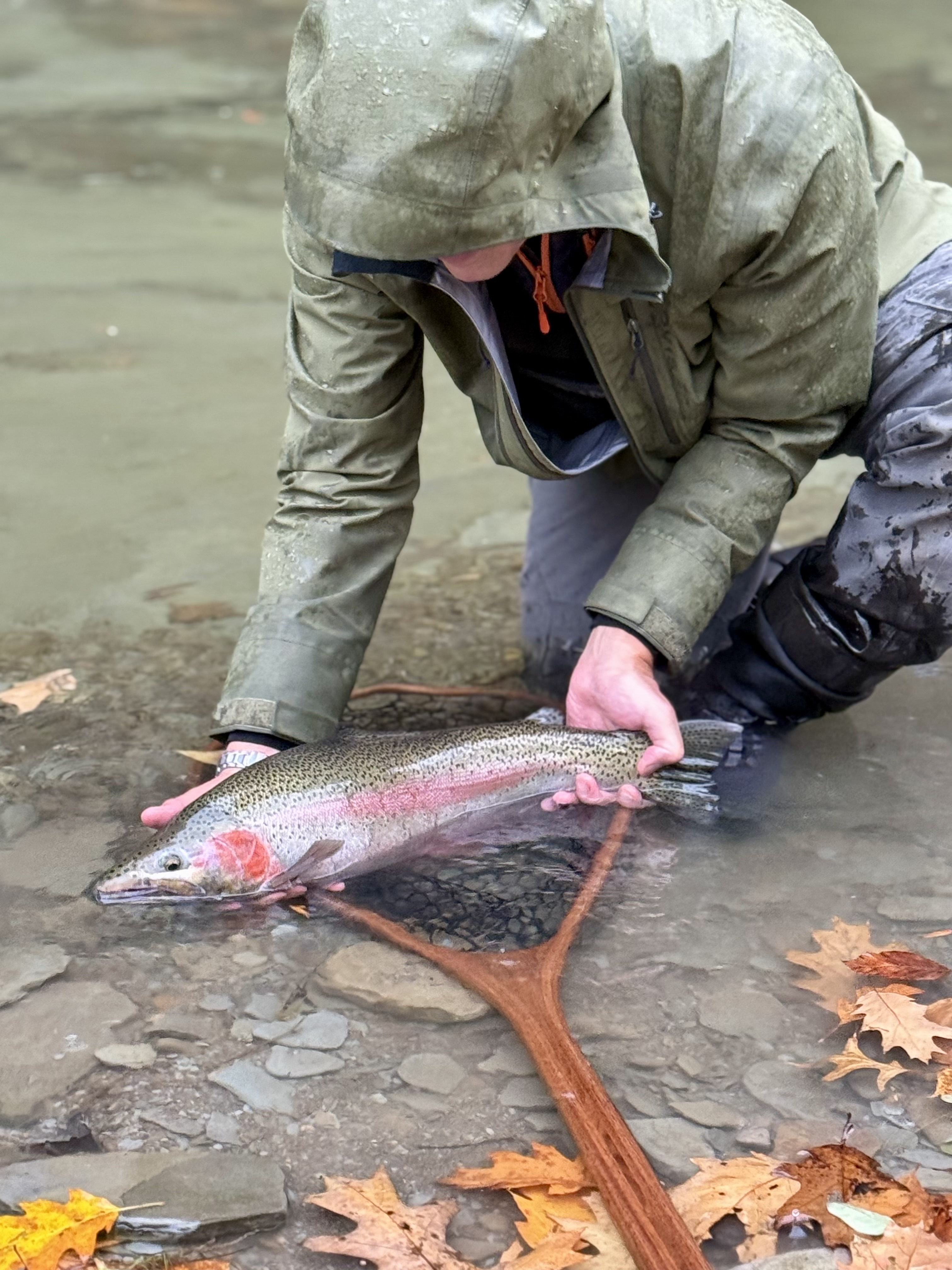 Then, the rains came. This was a boon to the bite; the fouler the weather, the more takes. When bite windows open, you’ve got to jump on them, and so we did. I had one epic eat from a fish that was part of pod hiding under a ledge. The presentation was tricky. I had to cast into the main current, then drag the flies toward the ledge in front of me, resume dead drift, and hope the team of two would pass through the strike zone unimpeded by the edge of the shale barrier. As the flies moved into position, I had to switch to a quasi tight-line presentation. Of the dozens of attempts I made throughout the afternoon, one worked. That was my favorite fish of the day.