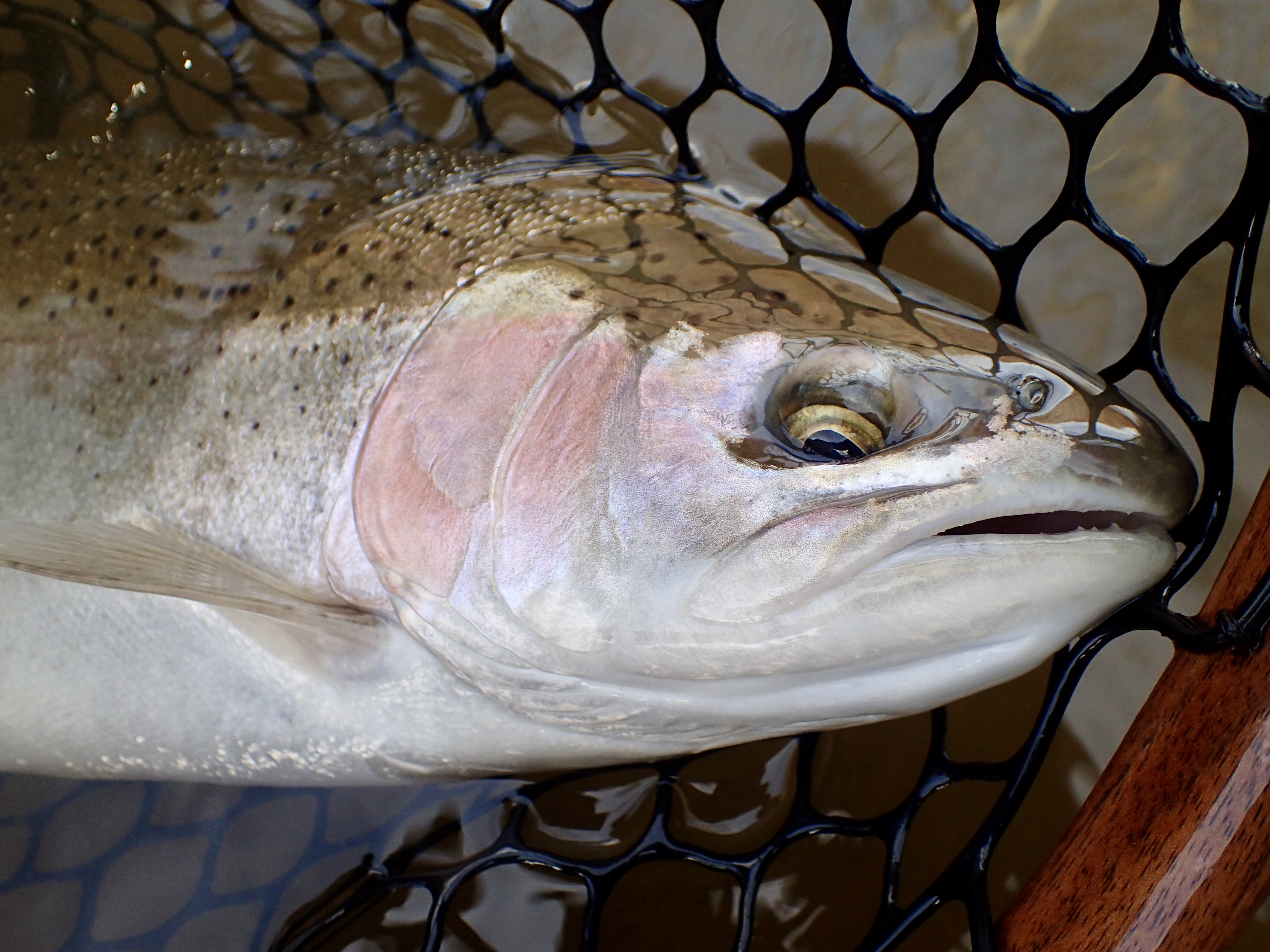 I had just made the comment that, with the climbing sun in my face, it was a wee bit difficult to see the indicator — but not to worry, because with the current moving so fast, the fish would set themselves. On cue, indicator down and fish on! I lost this steelhead to a snapped tippet, another when it ran between a pinch point of two submerged boulders, and two more to the whims of the steelhead gods. But I brought three to net, and, bad luck aside, considered myself ahead in the bargain.