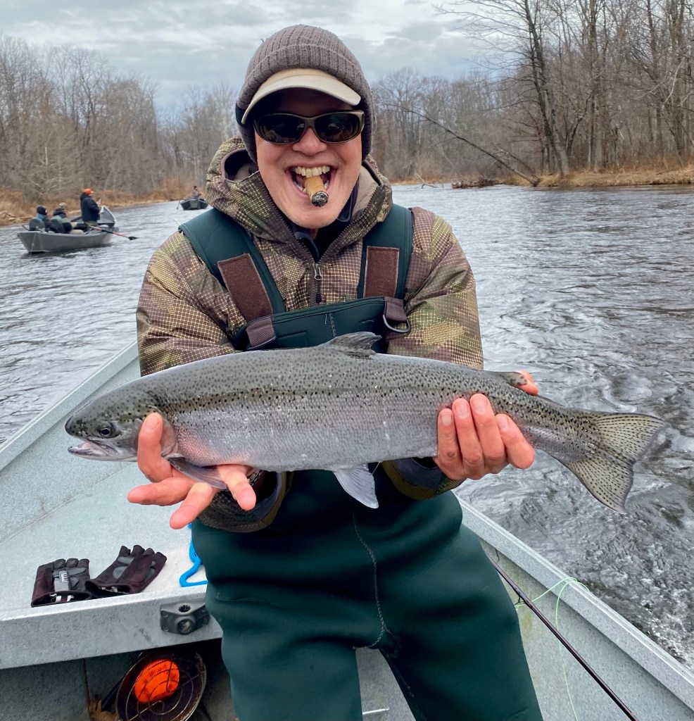 I’ll take two of those. After a couple hours of not-a-touch, I informed Jay that sometimes the key to hooking up is a cigar. Out Lady of Blessed Gispert Churchill came through. For those of you keeping score at home, we’re now at 282 steelhead landed.