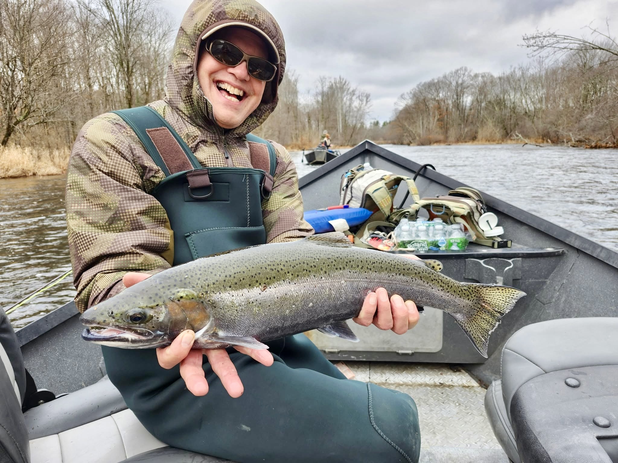 Conditions were just about perfect: dam release of 750cfs, 39 degree water, air temps above freezing with no precipitation. We fished the upper river on the first day, not far from the Altmar launch. There were steelhead in the immediate vicinity, but most of them were in front of other boats. We pecked away with egg patterns, but I dropped the first four I hooked. That had me flummoxed and moderately concerned.