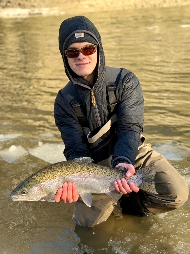 It’s been unusually cold this December in western PA. So much so that many of the steelhead tribs have been locked with ice. But mid-last week, there was a warming trend that offered both remedy and disaster. We (Number 3 Son Gordo) were scheduled to fish both Thursday and Friday. When we arrived on Elk Creek Thursday morning, conditions were as good as they’d been in a while: some ice, some color in the water, but very fishable lanes. As the temperature soared into the 50s, conditions deteriorated rapidly. First came the ice chunks — hundreds of them, in a seemingly endless string — floating down the cafeteria line, destroying any chance to make a drift. Next was the color: a light stain that morphed into a heavier stain, and finally an opaque mess the color of tea and milk. And of course, all this runoff was cold, making the water temp a feeding-unfriendly 32.5 degrees. Oh. I forgot the wind. 10-20mph, with 30+mph gusts. Sound like fun? This was about as challenging as winter steelheading gets.
