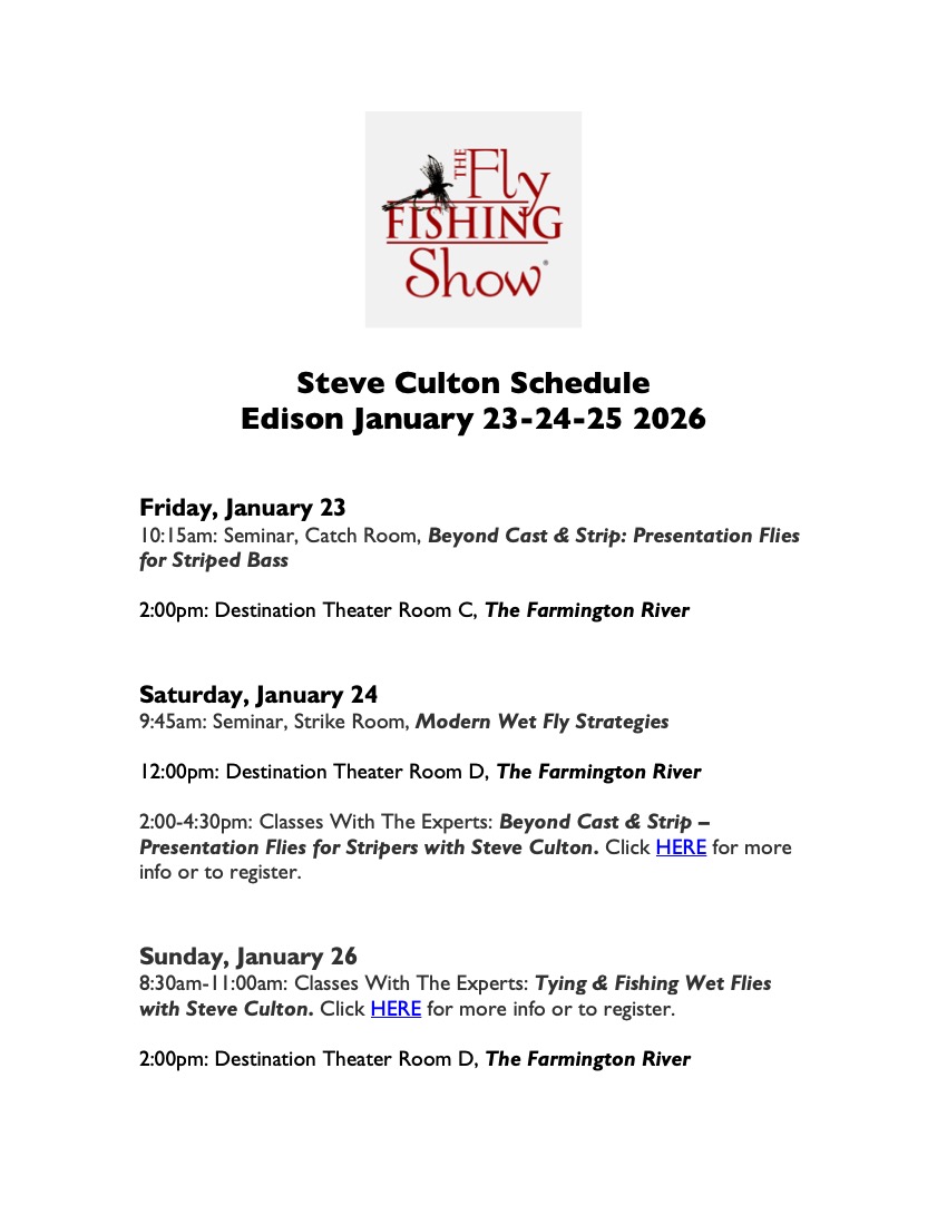 This is the biggest fly fishing show on the east coast, and I’m ready and rarin’ to go! While my plate isn’t quite as full as Marlborough, I’m still going to be out and about and meeting and greeting and presenting and teaching and…whew. I guess I’m going to be pretty busy. Here’s the rundown. Friday, January 23 at 10:15am: Seminar, Catch Room, Beyond Cast & Strip: Presentation Flies for Striped Bass; 2:00pm: Destination Theater Room C, The Farmington River. Saturday, January 24 at 9:45am: Seminar, Strike Room, Modern Wet Fly Strategies; 12:00pm: Destination Theater Room D, The Farmington River; 2:00-4:30pm: Classes With The Experts: Beyond Cast & Strip – Presentation Flies for Stripers with Steve Culton. Click HERE for more info or to register. Sunday, January 26 at 8:30am-11:00am: Classes With The Experts: Tying & Fishing Wet Flies with Steve Culton. Click HERE for more info or to register; 2:00pm: Destination Theater Room D, The Farmington River. I know snow is forecast for Sunday, but we can get you in and out of that class before it gets bad. The show will go on!