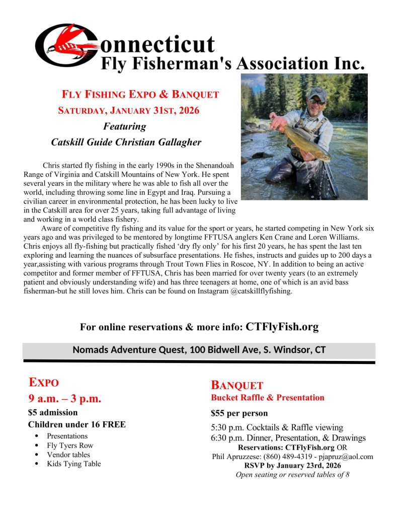Back from a terrific Fly Fishing Show in Edison, NJ, freshly dug out, and now prepping for “the best little fly fishing show around” — the CFFA Fly Fishing Expo & Banquet. It’s all happening this Saturday, January 31, from 9am-3pm at Nomad’s Adventure Quest in South Windsor, CT. This show is wonderful cure for cabin fever — I mean, it’s brutal out there, even by steelheading standards. I’ll be on Tyer’s Row for most of the day, probably focusing on wet flies, and taking a few walking breaks to stretch my legs and see what goodies the vendors have (I seem to always find a hidden gem that I didn’t know I needed). Stick around, because at 1:30pm I’m doing a new talk on the Farmington River. Even if you are a Farmington veteran, I guarantee you’ll learn something new. See you there, and don’t forget to come by and say hello.