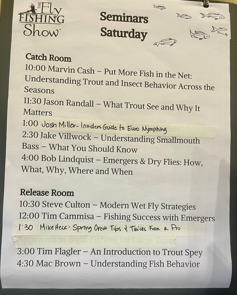 Saturday was typical busy for me at the FFS, with two talks and a class. The wild card this weekend was that my wife was with me. She planned to golf while I was doing my thing. At 10am Saturday, I made my way up from my tying table to the seminar room. That’s when I discovered that my laptop was missing. Rut-roh. It’s in the Jeep! Fortunately, I had the talk on a thumb drive, was able to borrow a laptop (thanks, Emily!) and get it configured with the projector (thanks, Frank!) and start just about on time. I can’t thank the show staff enough for coming to my rescue. I didn’t know what to expect, but I drew a great crowd for my 10:30am Modern Wet Fly Strategies talk. The post-talk Q&A was likewise excellent. Meantime, my wonderful wife came back to the show to drop off my laptop, which I had in time for my noon Farmington River talk. Another strong showing, so, as they say during a rock concert, “Thank you, Lancaster!”