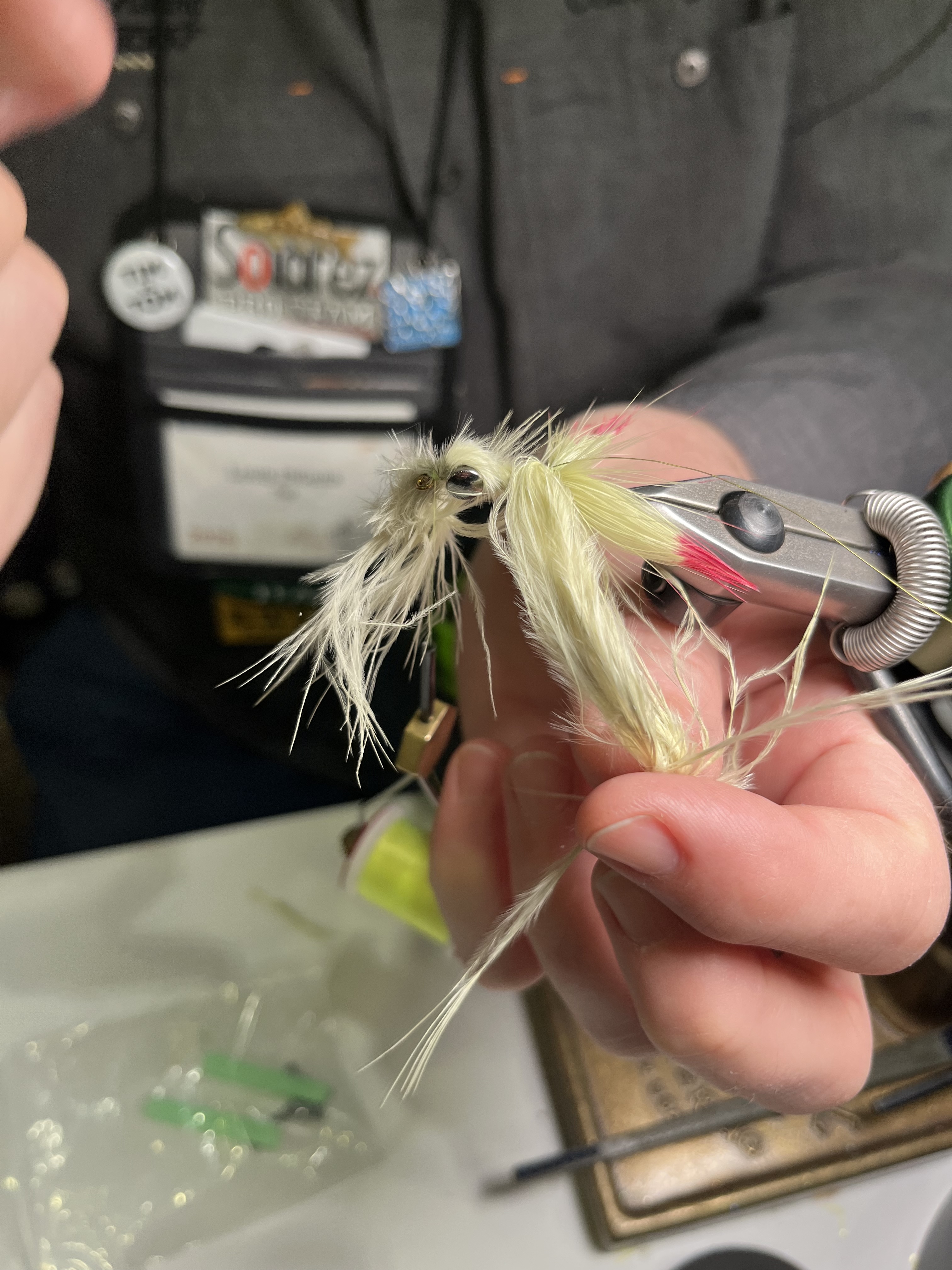 Sunday was far more relaxed; I had only my tying table (a FFS first for me) and another noon Farmington talk. I took the time to put my money where my mouth is when it comes to learning. I had Lou DiGena show me how to tie his wonderful crayfish jig pattern, the CE (Close Enough) Crayfish. I had Fritz Miller demonstrate how he ties in bucktail to form a thin, veiled collar (Fritz also sells some exceptional bucktail). I asked Bart Lombardo about tying small poppers for smallmouth. The Fly Fishing Show remains a tremendous opportunity to watch and talk and ask questions and learn from the best.