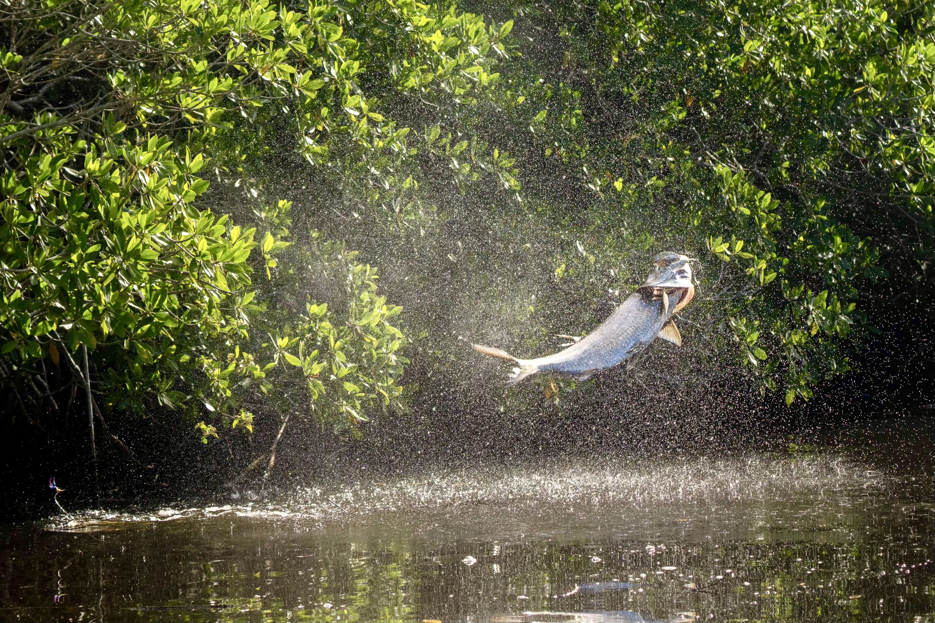 The tarpon thrashed on the surface, then sped away from the boat like a perp in a getaway vehicle. “Let him run!” shouted Capt. Mark, but I needed no coaxing as this fish immediately put itself on the reel. The first jump was a spectacle of power and fury, the spray shimmering in the morning sun like a thousand tiny LEDs. The tarpon made a sudden 180 and swam back to the boat. “Keep that line tight!” Reel fast!” were the captain’s instructions, but I was already doing it. I cranked furiously, still tight to the fish. It was at this moment that I knew I was going to land this fish. But I didn’t plan for the mangrove wild card.