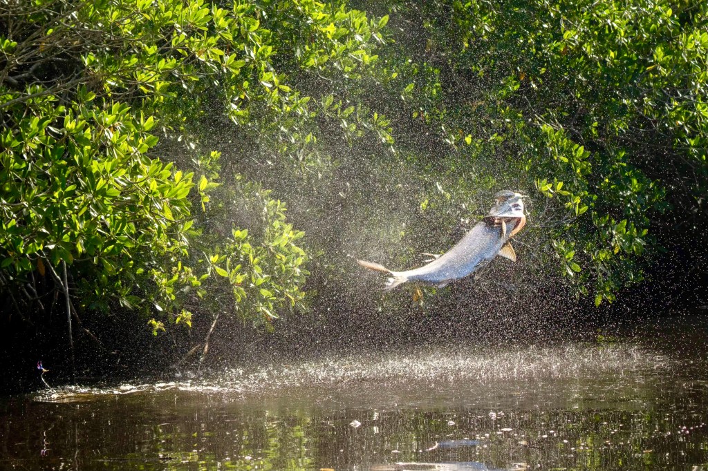 The last blast, the moment the tarpon escaped the bond of the hook and line. You can see the fly, stuck on the tiny branch peeking out of the water on the lower left. The fish landed with a thunderous splash. Then it was gone. Photo by Mark Giacobba.