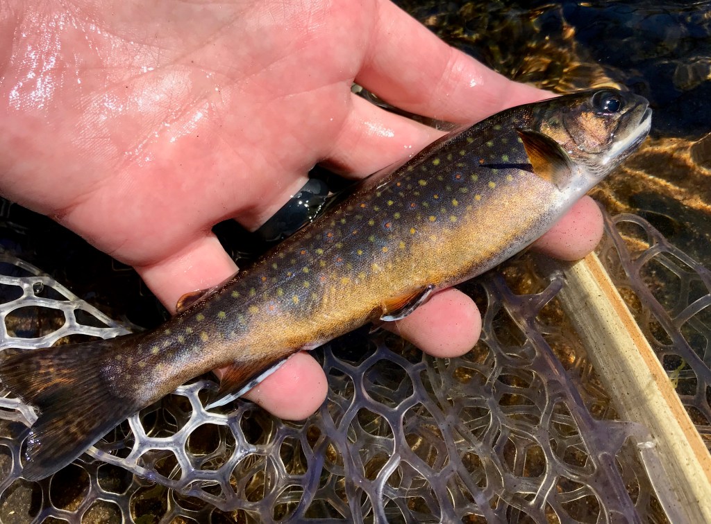 Right away I could tell it was a good fish. If it were the Farmington River I’d consider it a smaller trout, but on this stream it was a giant. I desperately wanted to land it, because I felt like this was the fish I was supposed to get, and somehow Alan was involved, and I didn’t want to let him down. Just as I’m lifting the fish toward the net, my rod tip and line got tangled in some branches. Really? The fishing gods can be so cruel. But in the end, the char was netted. Funny thing! It was the biggest brookie, by far, that I’ve ever caught on this stream.