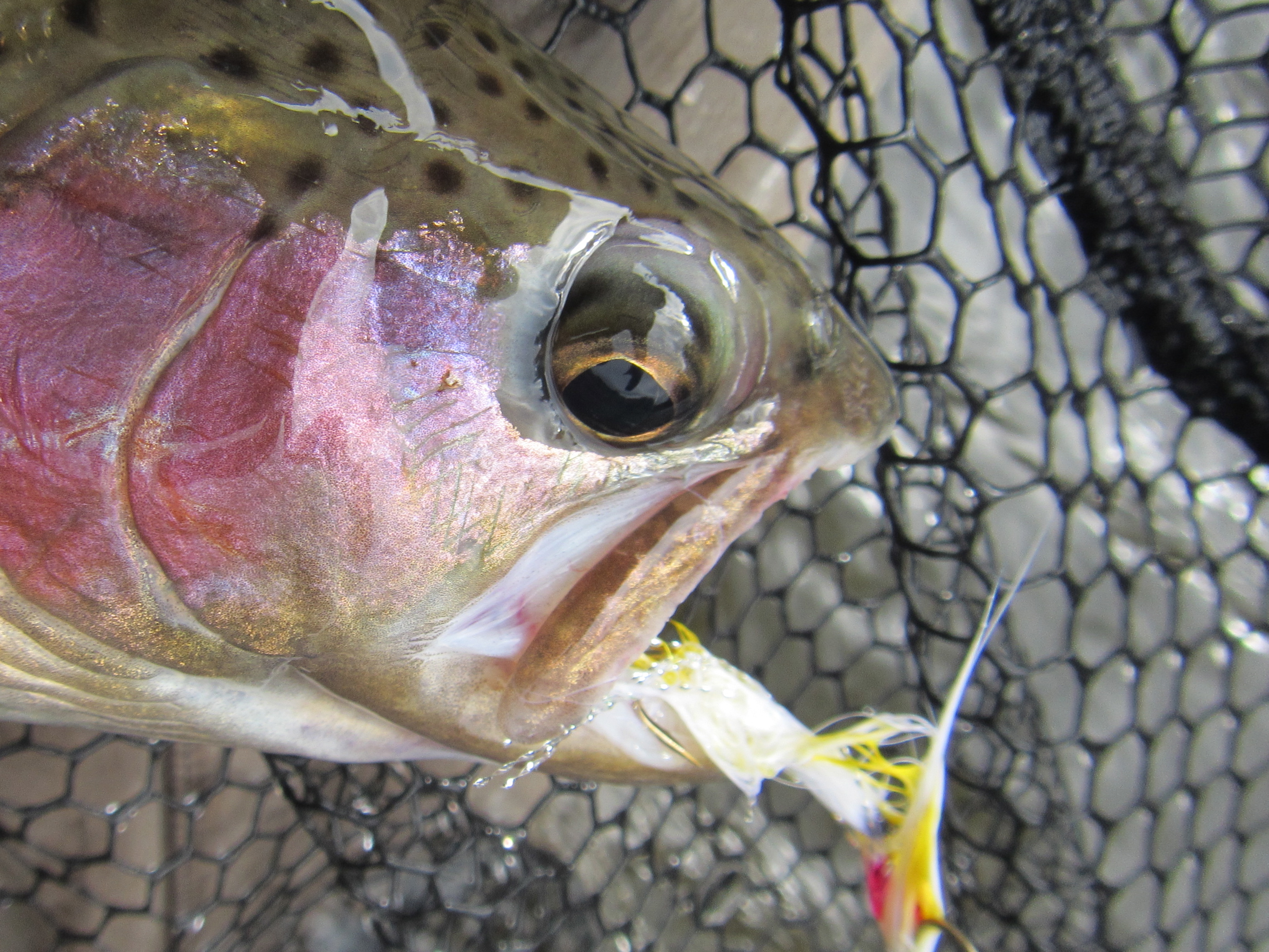 Notes from last night: water at 270 cfs. I fished two runs from 6pm to 9pm. The first was TeQueely territory. Lots of action, although there is a structure-laden frog water section next to current and a deep hole that continuously, mysteriously fails to produce. I’m going to have to re-visit at dusk. White flies are just about done — in fact, there were far more sulfurs on the water last night. Also small tan caddis, and the ubiquitous black caddis. The two fly team of white fly soft hackle (I’m calling it the August White) on point and Black Magic dropper continues to shine. I’m swinging wets far more than I did last summer, mostly pre-hatch, and the bass just can’t keep away. Multiple doubles last night, and the Black Magic out-caught the August White 2:1. I’m targeting active feeders, swinging through and across current seams, but I’m doing boffo box office on the dangle with a slow hand-twist retrieve. Best fish last night, 9″, came on this last presentation (Black Magic).