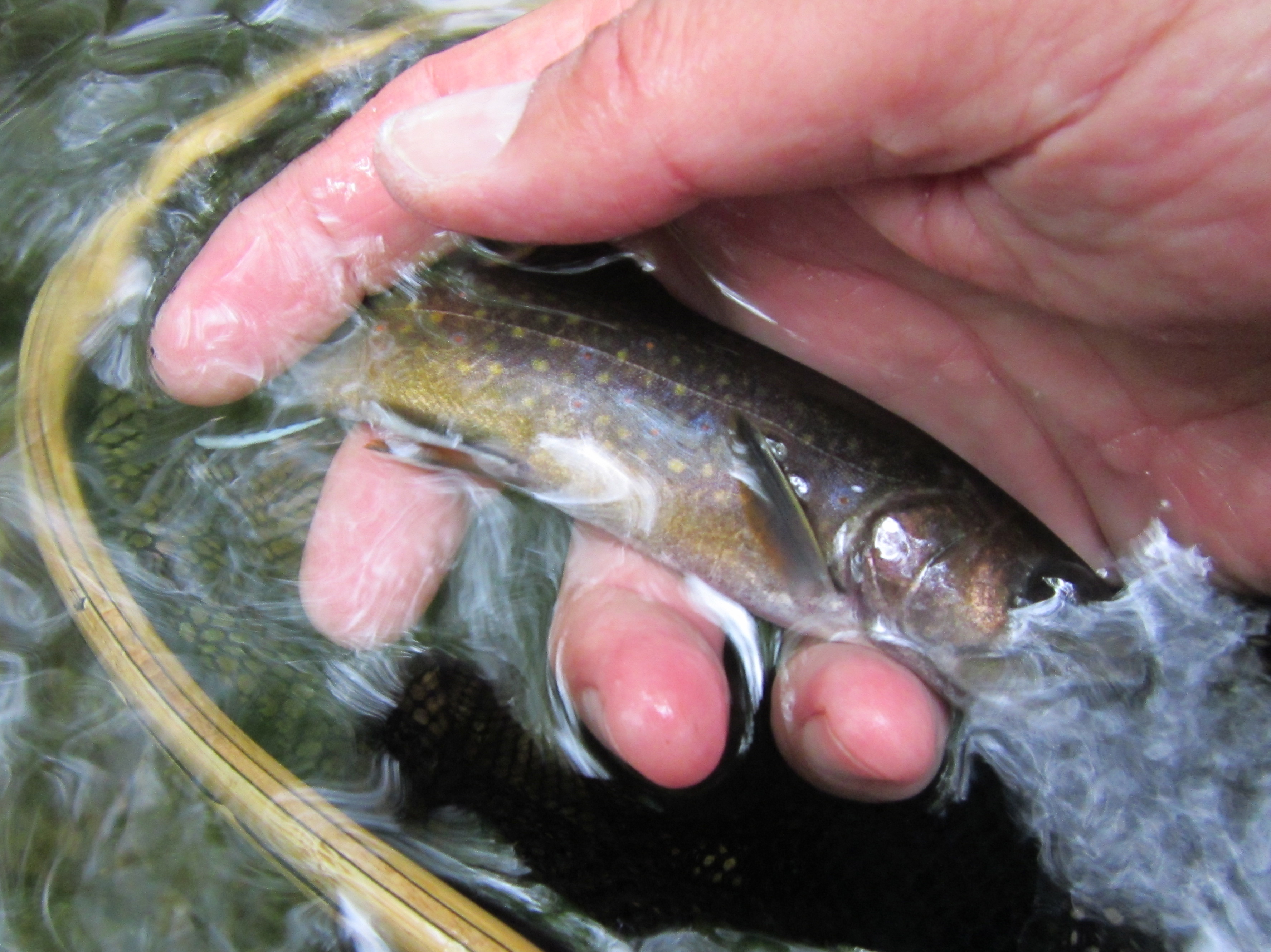 My best brookie of the day took a dry presented upstream in a dappled seam that rushed along the side of a large boulder. She ran all the way into the bottom of the next pool. Terrific little fighter, this one.