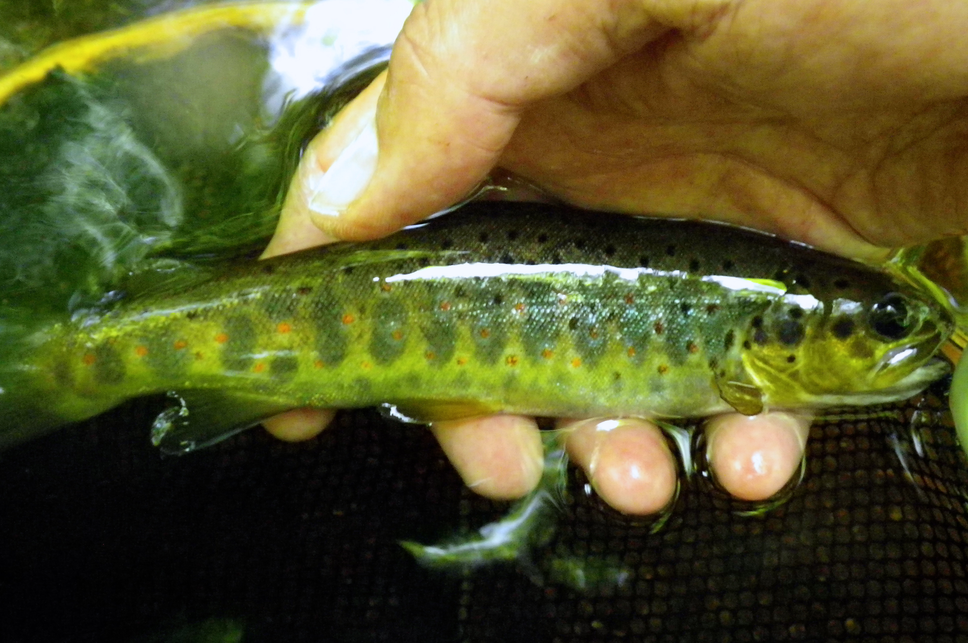 This time it took only one cast. The dry vanished from the surface, and when I raised the rod tip I could see that the nymph had been the target. It was a good brookie, and I immediately assumed it was Alan. Into the net, camera readied, shot taken, release completed.
