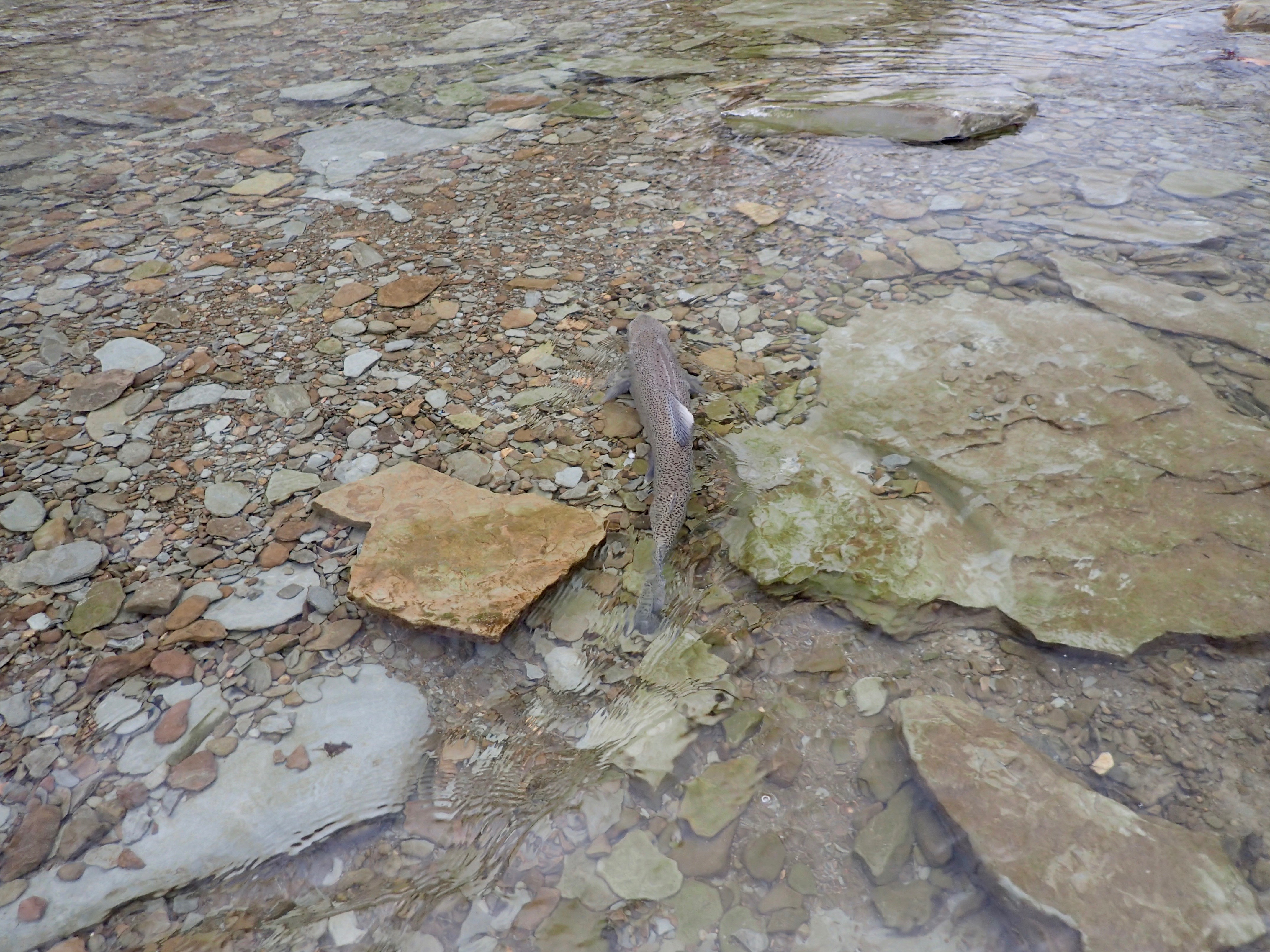 Harsh conditions. They’ve gotten ridiculous rain and snow since then, so where I’m standing is probably up to my chest! The fish were on high alert — we saw raptors everywhere and several fish with bird attack wounds. If the water had a flat surface and you were in the fish’s vision cone, they generally wanted nothing to do with your offerings. Even in the bigger, deeper pools that held a hundred steelhead, virtually every drift went ignored. With little-to-no current it was difficult to even get a drift. You had to make ultra-precise casts to get them to eat.I had my greatest success targeting fish that held in the shallow broken water of dump-ins and pockets. One such spot produced two steelhead. Here’s one of them. We fished Blood Dot eggs, White Death Zonkers, and pink Squirmy Worms, and the Blood Dot was the overwhelming favorite. Since you can fish two flies in PA, all of the flies were dropped off an another Blood Dot. This was the first time I’ve ever fished for steelhead without any weight. I also tried a new tactic to get my flies into the lane: as soon as the flies hit the water, I dragged them as needed to move them into position. Success!I finished the first day in public water. Holy hyper-spooky steelhead, Batman! It was extremely difficult to get into casting position, let alone present, without triggering the flight reflex. I managed one fish before a squall front moved in and blasted the area with gusty winds and torrential downpours. The next day, the creek was way up and running the color of tea with a dash of milk. Great color, but leaves were an issue. That influx of water moved all the steelhead out of the section I fished, and unfortunately no replacements came in overnight. I fought the good fight, but I didn’t get a single touch, and saw only one other fish hooked all morning. Time to head home and get ready for…